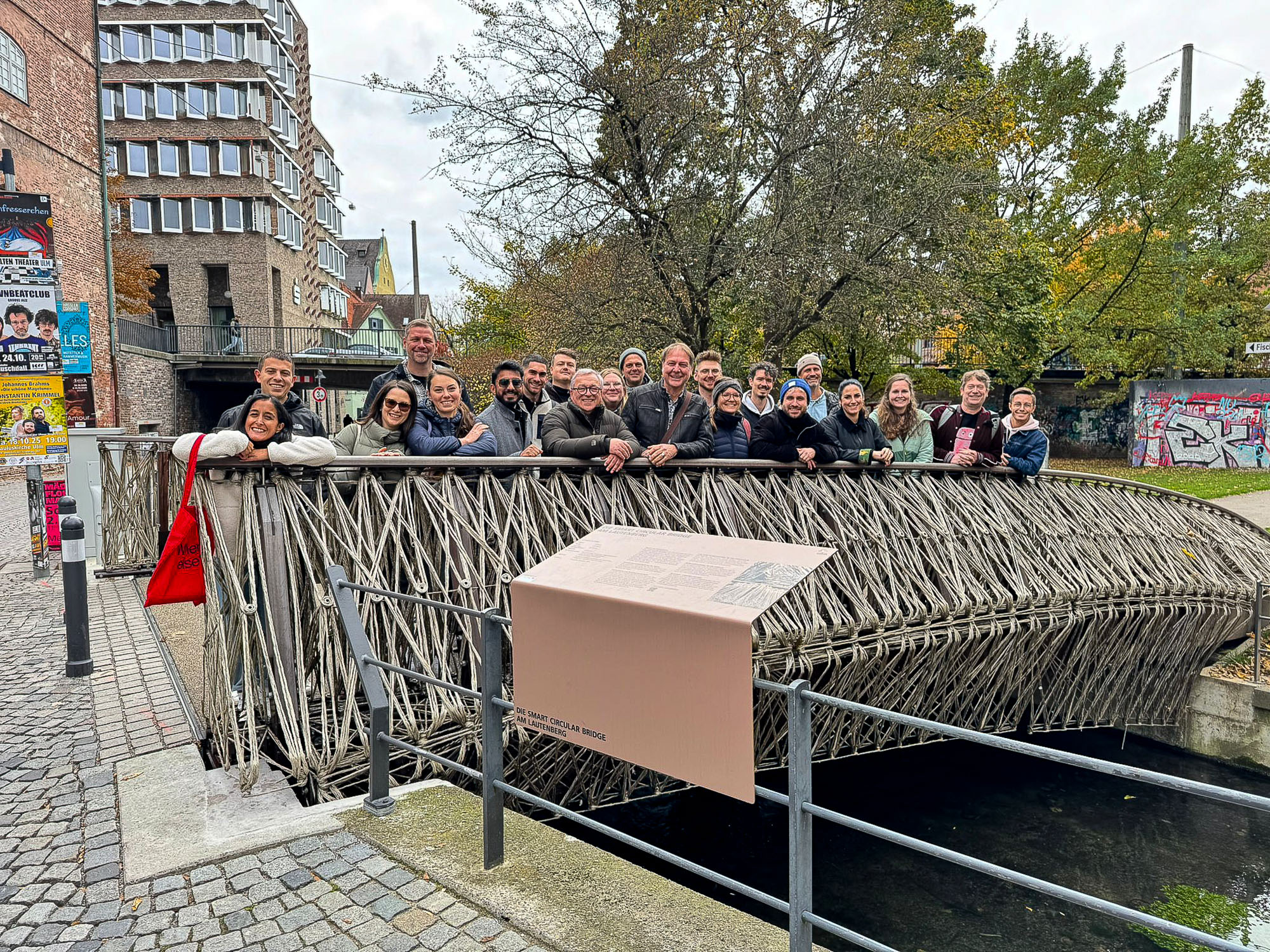 Der finale Programmpunkt war ein besonderes Highlight: ein Gruppenbild an der smart circular bridge am Lautenberg. Diese unkonventionelle Brückenkonstruktion aus nachwachsenden Rohstoffen steht nicht nur architektonisch für Neues, sondern vor allem für den Umgang mit Materialien in einer zirkulären Bauweise – ein Thema, das auch bei uns in vielen Projekten eine zentrale Rolle spielt.