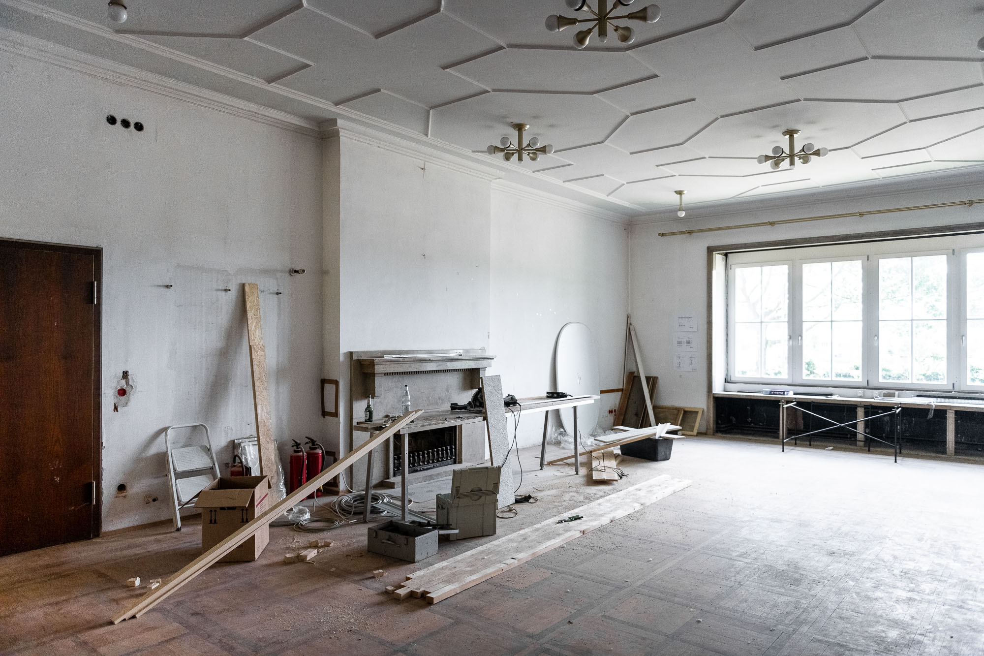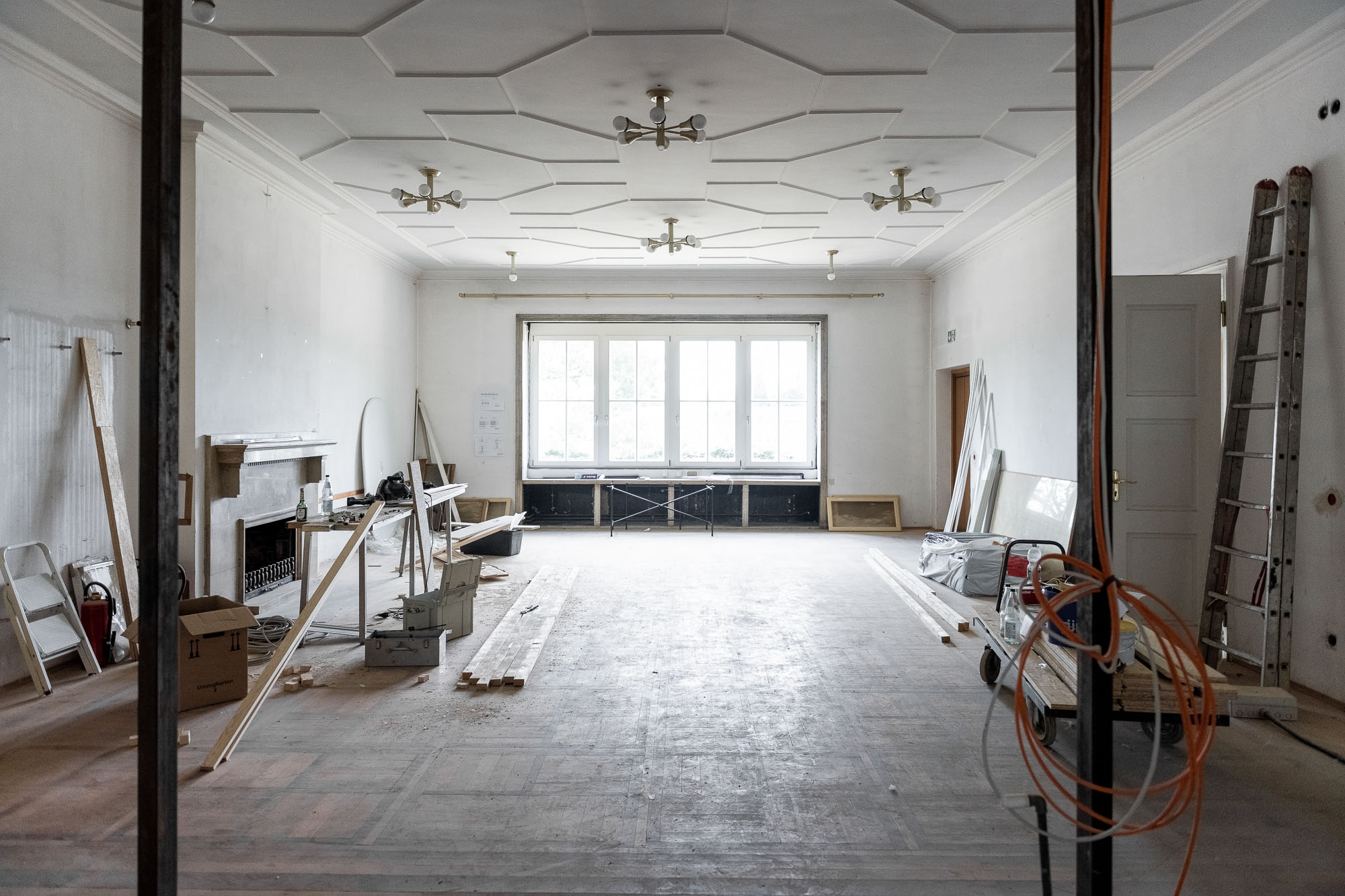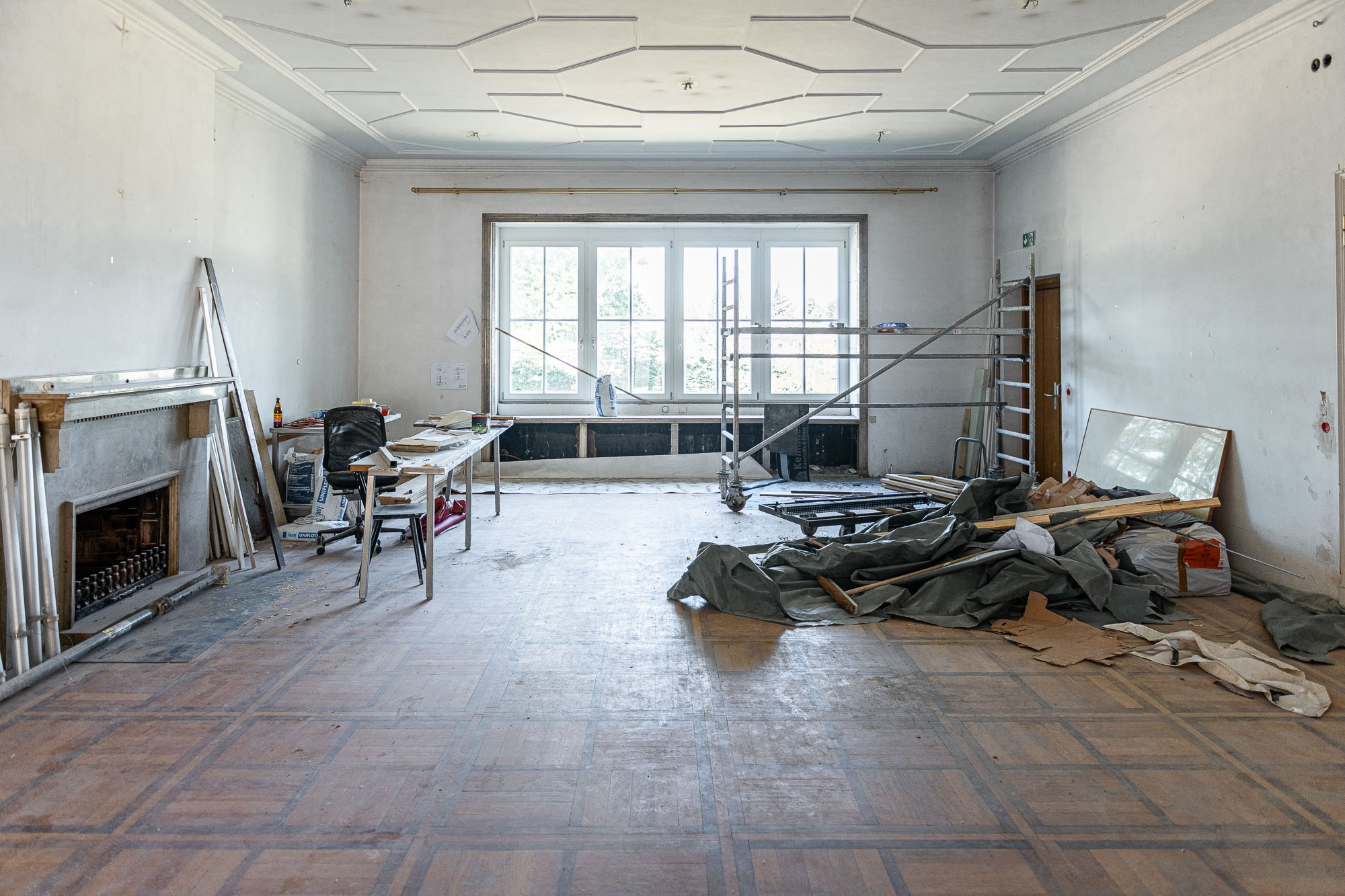 Die Besonderheit des Raumes ergibt sich, neben dem Kamin, der Stuckdecke mit mehreren Kronleuchtern und dem Parkettboden, aus dem stirnseitige große Fenster, auf das beim Betreten der Räumlichkeit sofort der Blick fällt.
