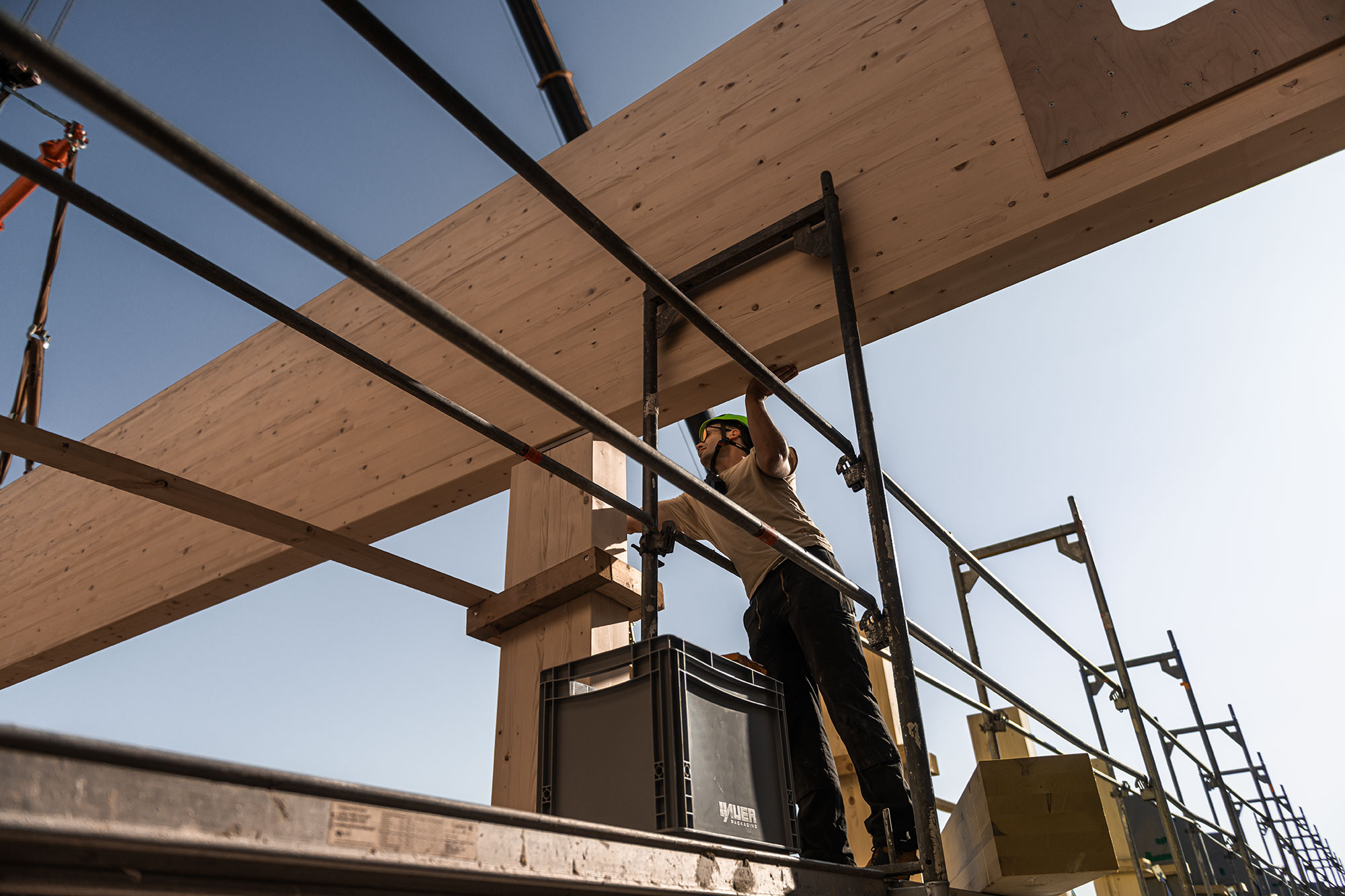 Nach der erfolgreichen Schwertransportlieferung der 21 Holzbinder mit je 40 Meter Länge stehen für die kommenden Tage noch weitere beeindruckenden Ereignisse an. Um die weiteren ausladenden und schweren Holzteile bewegen zu können, musste ein spezieller Lastenkran an der Baustelle positioniert und mit zusätzlichen Gewichten versehen werden. Dieser ermöglicht jeweils für die beiden Bauabschnitte der Sport- und der Kulturhalle innerhalb weniger Tagen die gesamte vorgeplante Dachkonstruktion von 4100 m² an Ort und Stelle zu montiert.