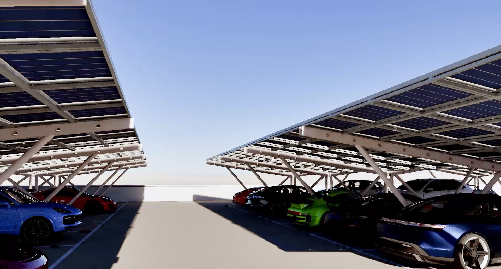 Das auf flächeneffizient optimierte, doppelstöckige Gebäude hat ca. 60 Parkplätze auf dem Dach, erreichbar über eine Rampe, die im Osten und Norden um das Gebäude führt. Die Stellflächen werden vollflächig mit einer PV-Anlage überbaut. So wird ein Großteil des Stromverbrauchs direkt am Gebäude gewonnen und die exklusiven Fahrzeuge vor der Witterung und Sonne geschützt.