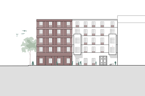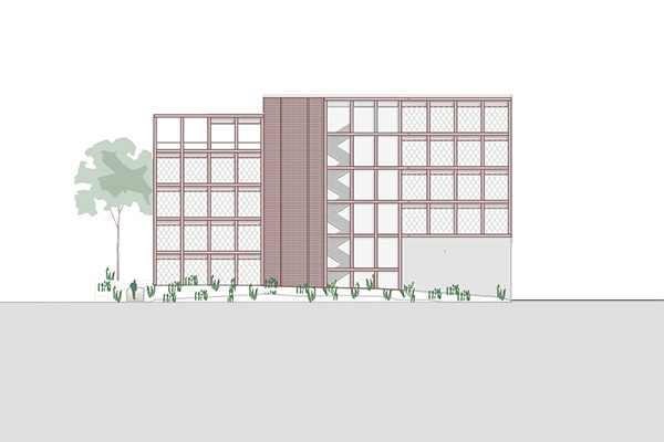 Der Bestand wird teil rückgebaut, um eine optimale Basis für eine wertige Erweiterung zu schaffen. Die Wohneinheiten werden funktional und effizient gegliedert. Die Erschließungszonen bieten unterschiedliche Breiten, um die Fluchten zu brechen und Kommunikationsräume zu bieten. Im Erdgeschoss werden Gemeinschaftsräume mit direktem Zugang zum geschützten Innenhof angeboten.