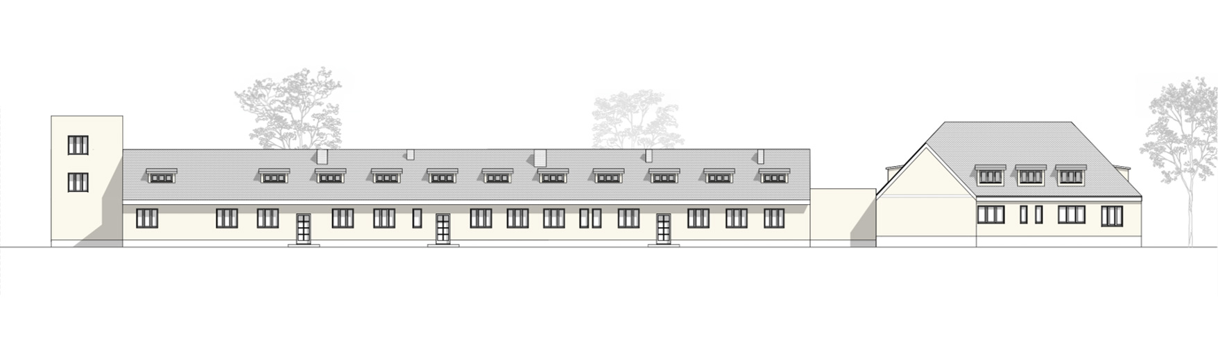 Stadthäuser mit Einheiten von 2,5 – 6,5 Zimmern. In Variante 3 wird der Rondellplatz als verkehrsberuhigter Bereich mit als Parkflächen und Ausbildung von Aufenthalts- und Spielflächen im Bereich Baumbestand und Kleingärten mit West- und Südorientierung genutzt. Das Dach wird im West- und Südbereich für mehr Lichteinfall und Nutzfläche angehoben. Der äußerliche Charakter des denkmalgeschützten Bestandsbaus bleibt vom Rondellplatz aus erhalten.