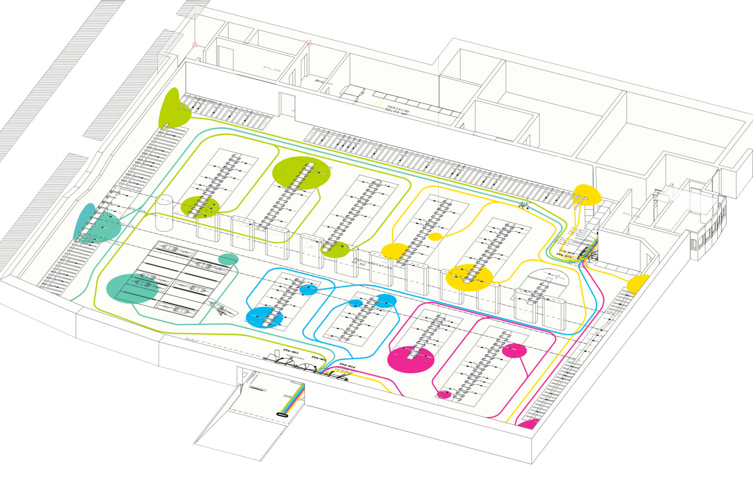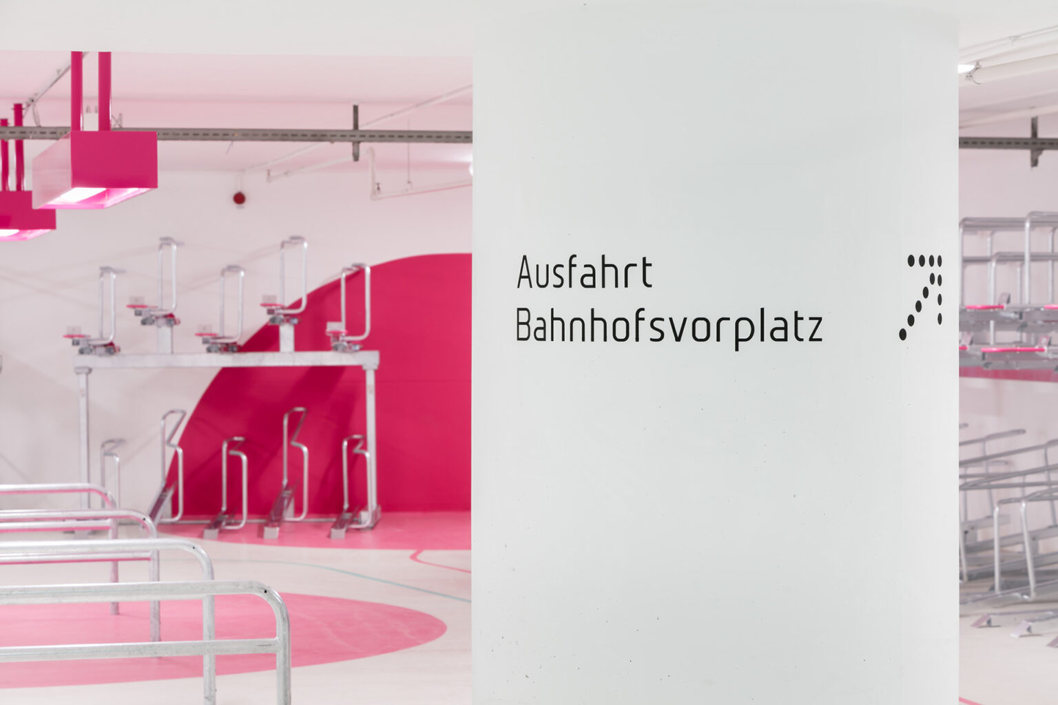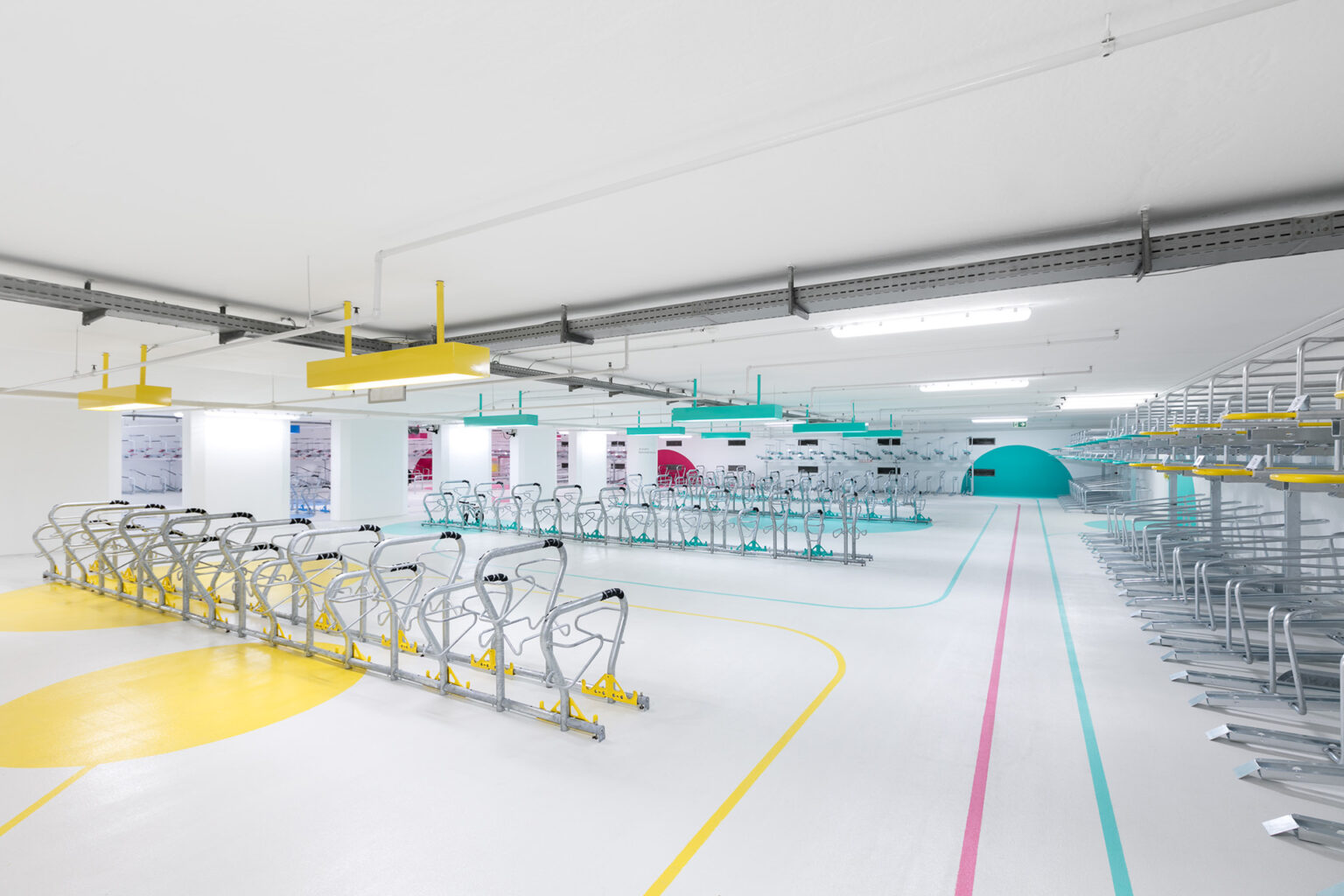 Die 5 Zonen der 1.280m2 großen Fläche wurden mit 5 frischen Farbtönen gekennzeichnet, die sich auch als Linienführung auf dem Boden sowie als Flächen an Türen und Wänden wiederfinden. In Anlehnung an gelernte ÖPNV-Netzpläne dient diese moderne Gestaltung zur Orientierung auf allen Flächen und wurde sogar ins offizielle Logo der Fahrradstation Süd übernommen.