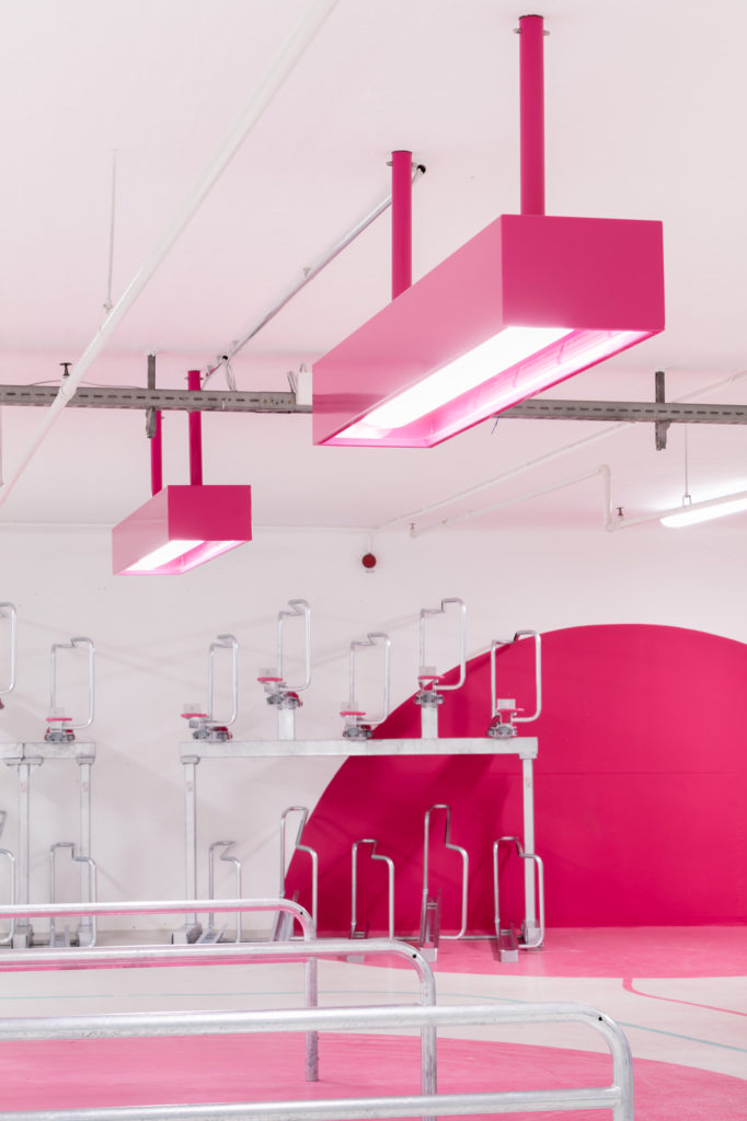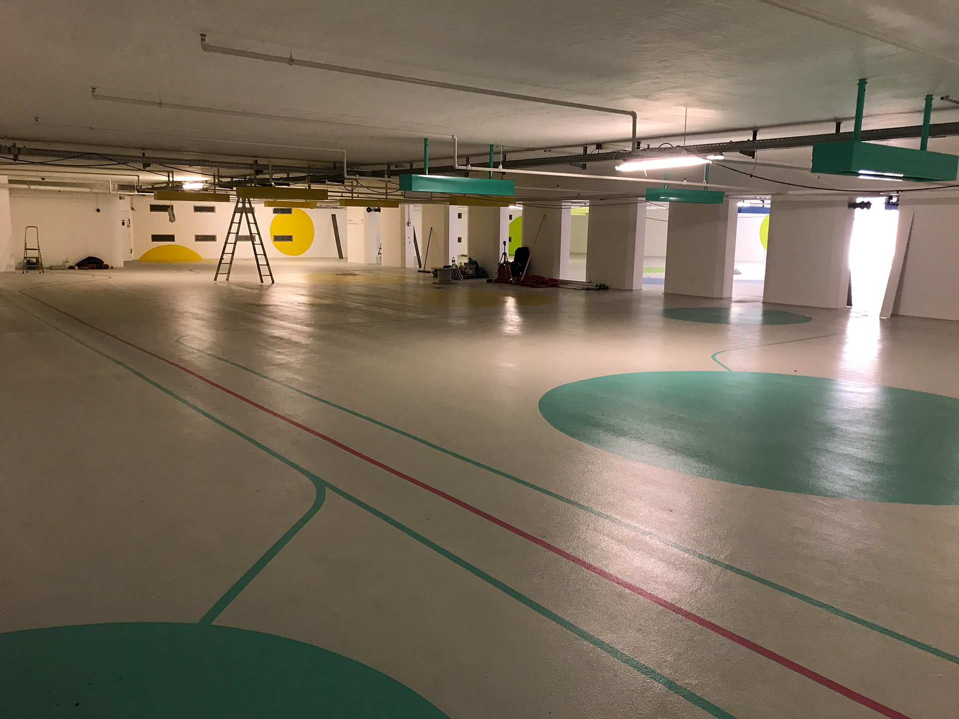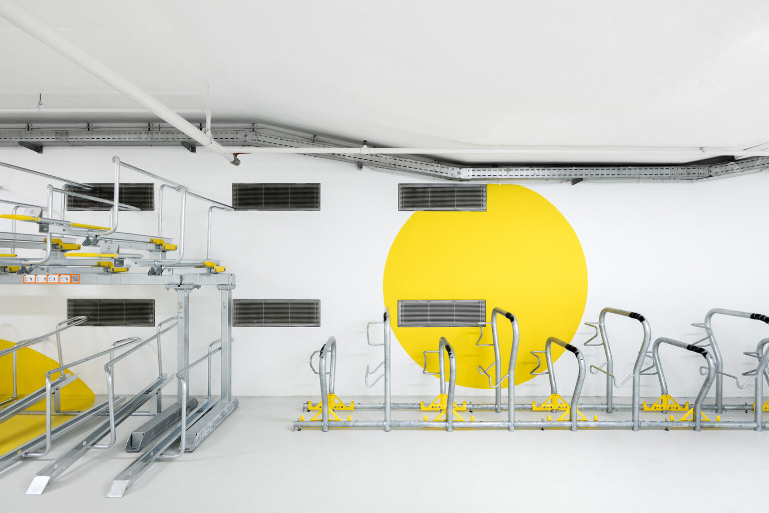 Die 5 Zonen der 1.280m2 großen Fläche wurden mit 5 frischen Farbtönen gekennzeichnet, die sich auch als Linienführung auf dem Boden sowie als Flächen an Türen und Wänden wiederfinden. In Anlehnung an gelernte ÖPNV-Netzpläne dient diese moderne Gestaltung zur Orientierung auf allen Flächen und wurde sogar ins offizielle Logo der Fahrradstation Süd übernommen.