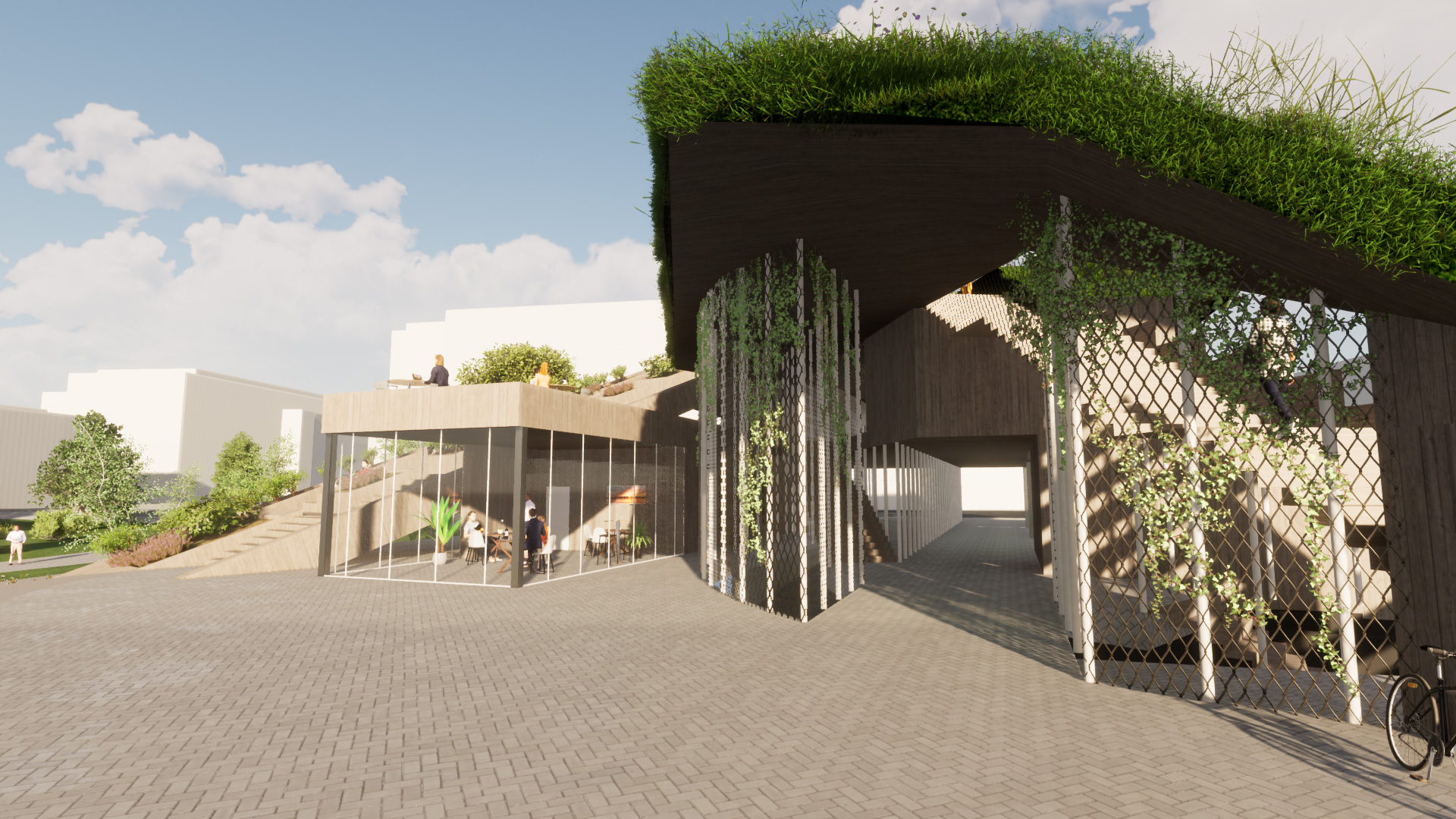 Der Bau gliedert sich äußerlich aus holzverkleideten Kuben mit dem sich darüberlegenden, intensiv begrünten Dach.