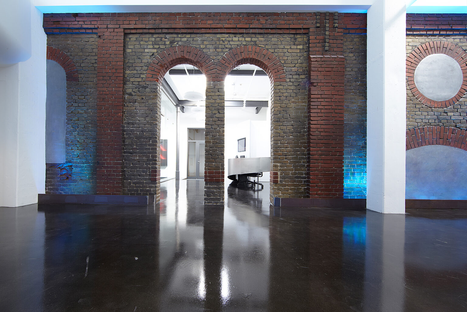 Und so besteht unser realisierter Entwurf aus einer Eingangshalle mit einladendem Empfang und gegenüberliegendem großzügigen Besprechungsraum – alles innerhalb der historischen Substanz. Nachdem zwei Rundbogentore freigelegt wurden, gelangt man nun ins Loftbüro mit Galerie und Raum für bis zu 70 Arbeitsplätzen. Die Segmentierung findet hier ihren Ursprung im Entwurf und nicht in der Möblierung. Zusätzliche Neben- und Sozialräume wurden unterhalb der Galerie angeordnet.