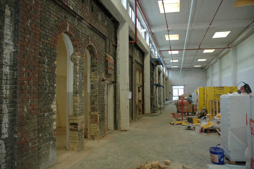 Obwohl nur wenige Eingriffe in die Substanz der Röhre vorgenommen wurden, hatten diese eine immense Wirkung. Mit viel Liebe zum Detail, den Industriecharakter des Komplexes immer im Fokus, wurde die ursprüngliche Außenfassade der Bettfederfabrik behutsam hinter einem einfachen Blendmauerwerk freigelegt und restauriert. Um ein Maximum an warmem Tageslicht zu ermöglichen, wurden die Kurzseiten der Fassaden vollständig geöffnet. Die Verglasung verstärkt hierbei die Wirkung des langen Raumes und ermöglicht einen fantastischen Blick auf die historische Industrielandschaft sowie das Hafenbecken.