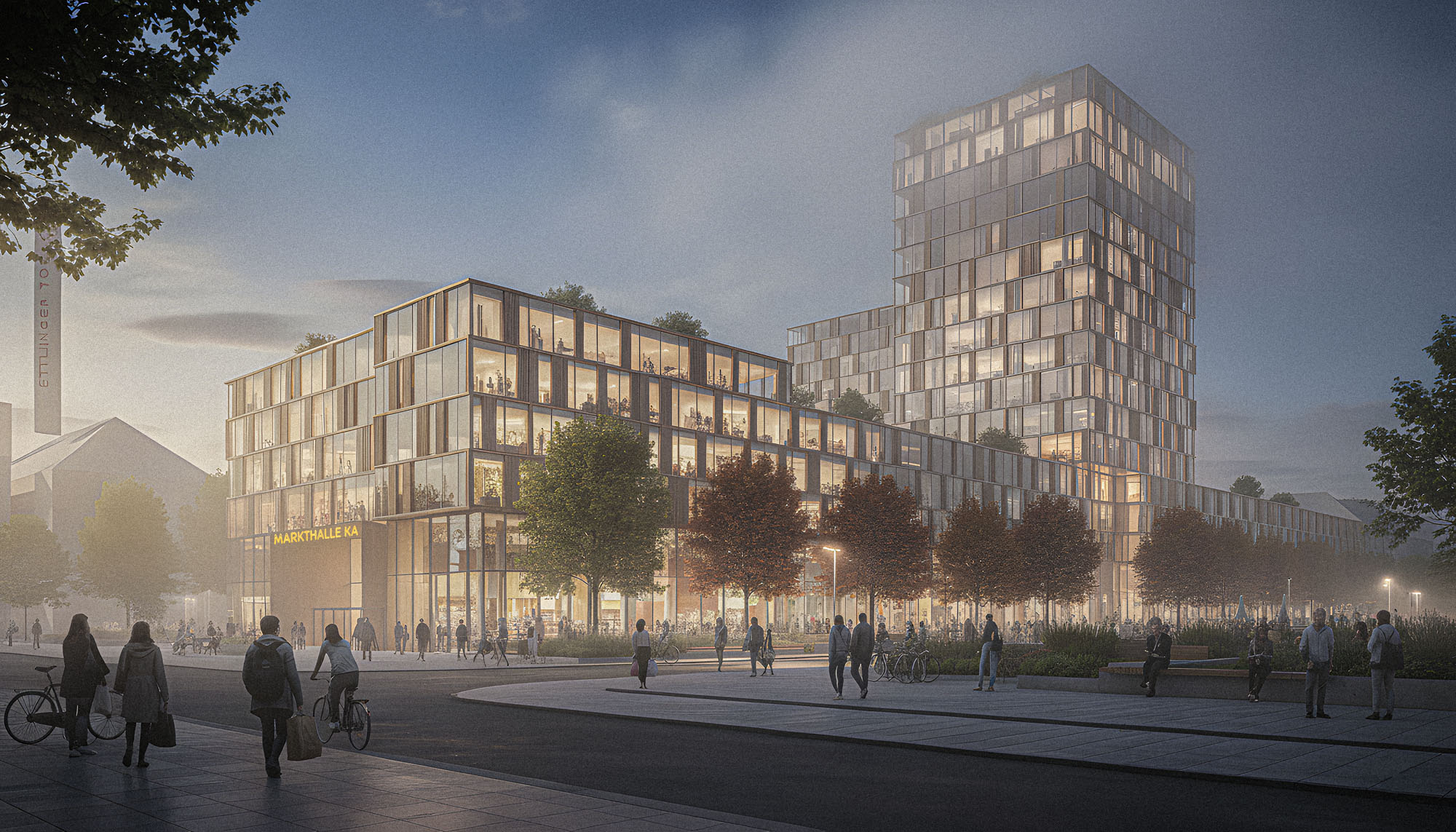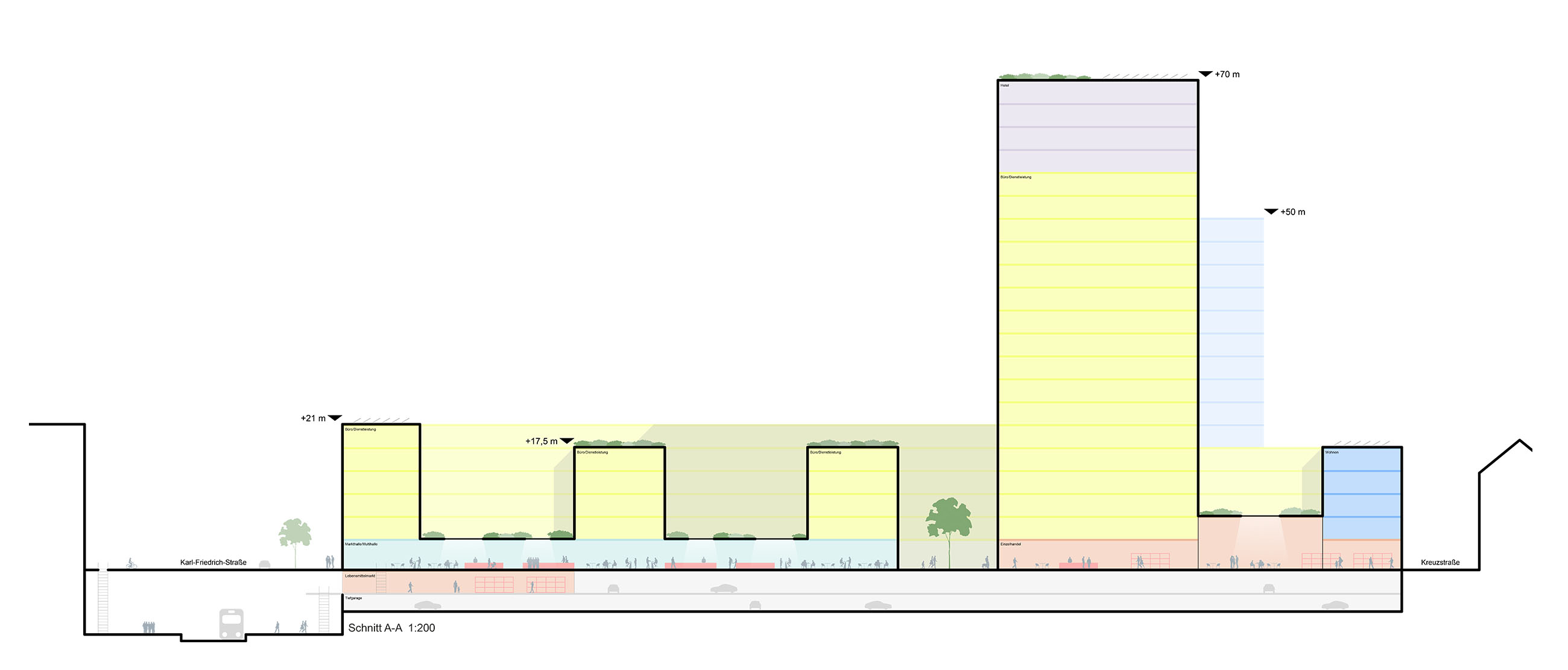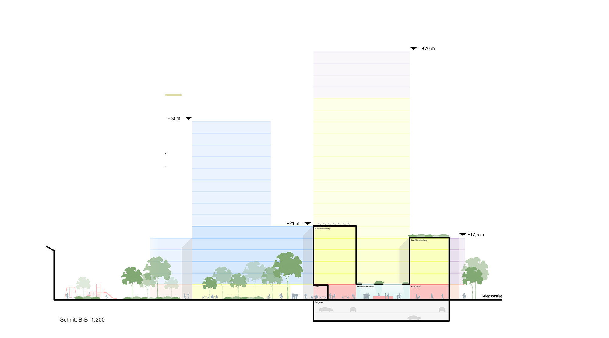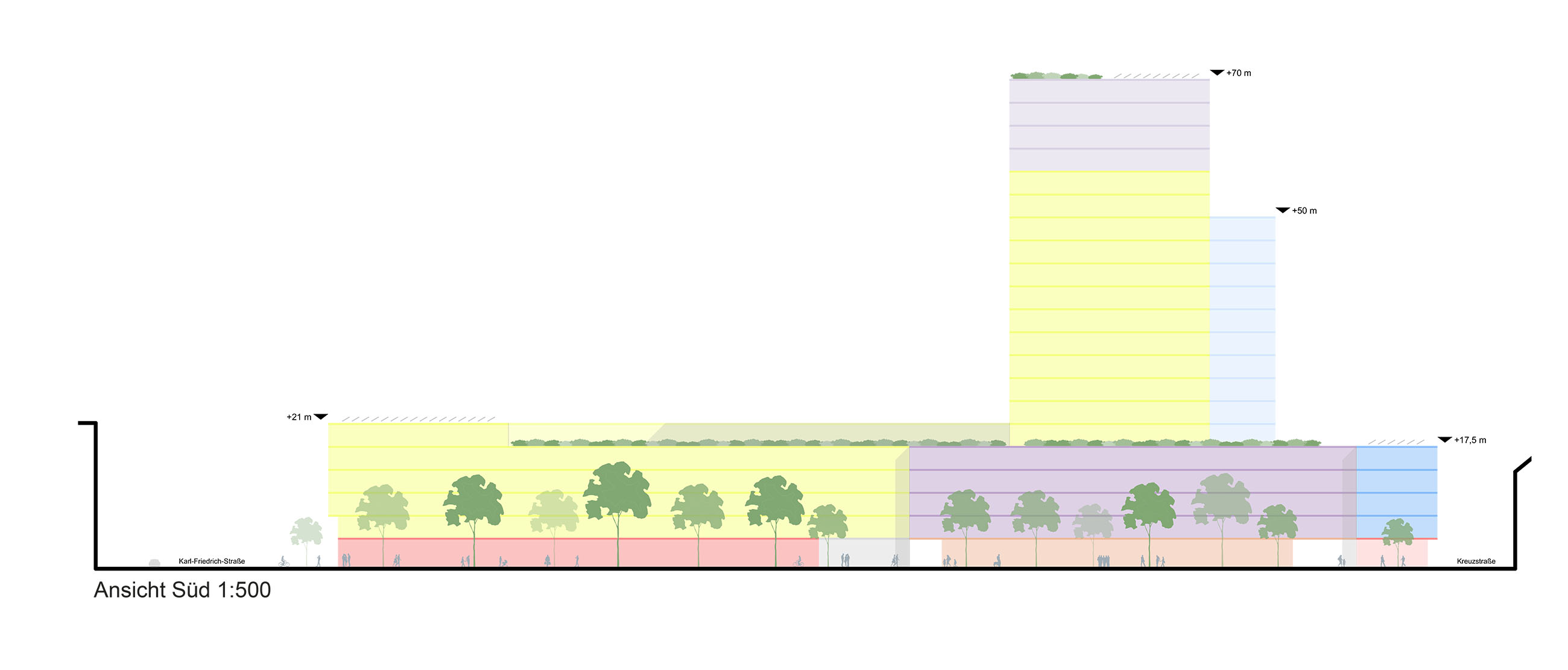 Der Entwurf für das Quartier K100 gliedert sich in drei eigenständige Bausteine mit unterschiedlichen Nutzungen: Wohnen, Arbeiten, Hotel und urbane Versorgung. Eine zentrale Markthalle, gemeinschaftliche Dachgärten und großzügige Innenhöfe schaffen Raum für Begegnung und Vielfalt im Alltag. Die Freiräume orientieren sich an der historischen Gartenstruktur des Markgräflichen Palais und erweitern sich zu einem parkartigen Grünraum mit hoher Aufenthaltsqualität. Durch kompakte Logistik, Mobilitäts-Hubs und eine grüne Promenade wird das Quartier funktional vernetzt und zugleich städtebaulich eingebunden – ein zukunftsweisendes Stadtmodul, das historische Bezüge und neue urbane Lebensformen verbindet.