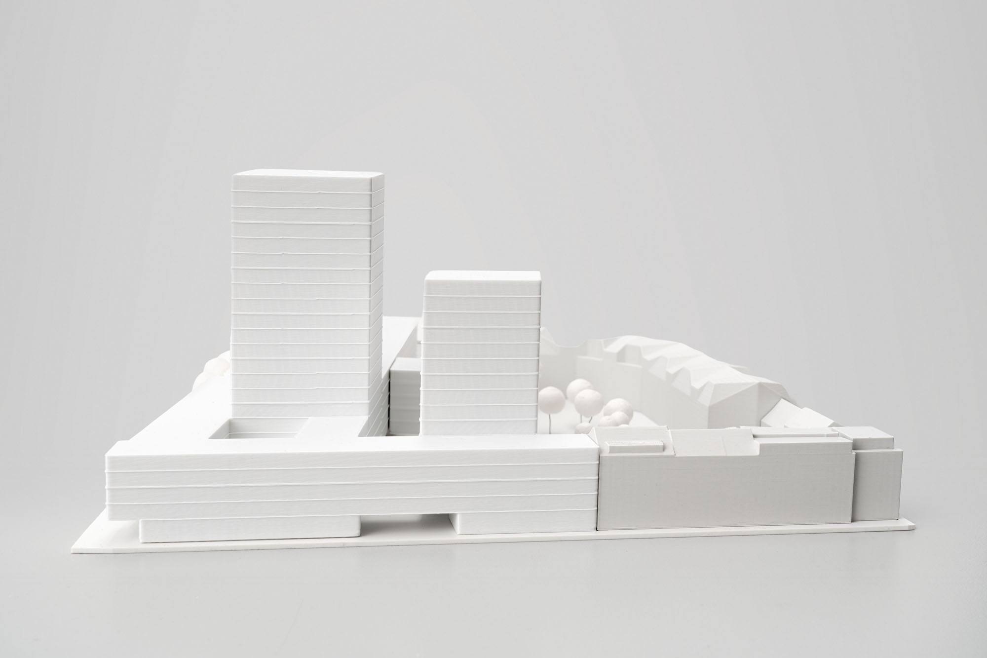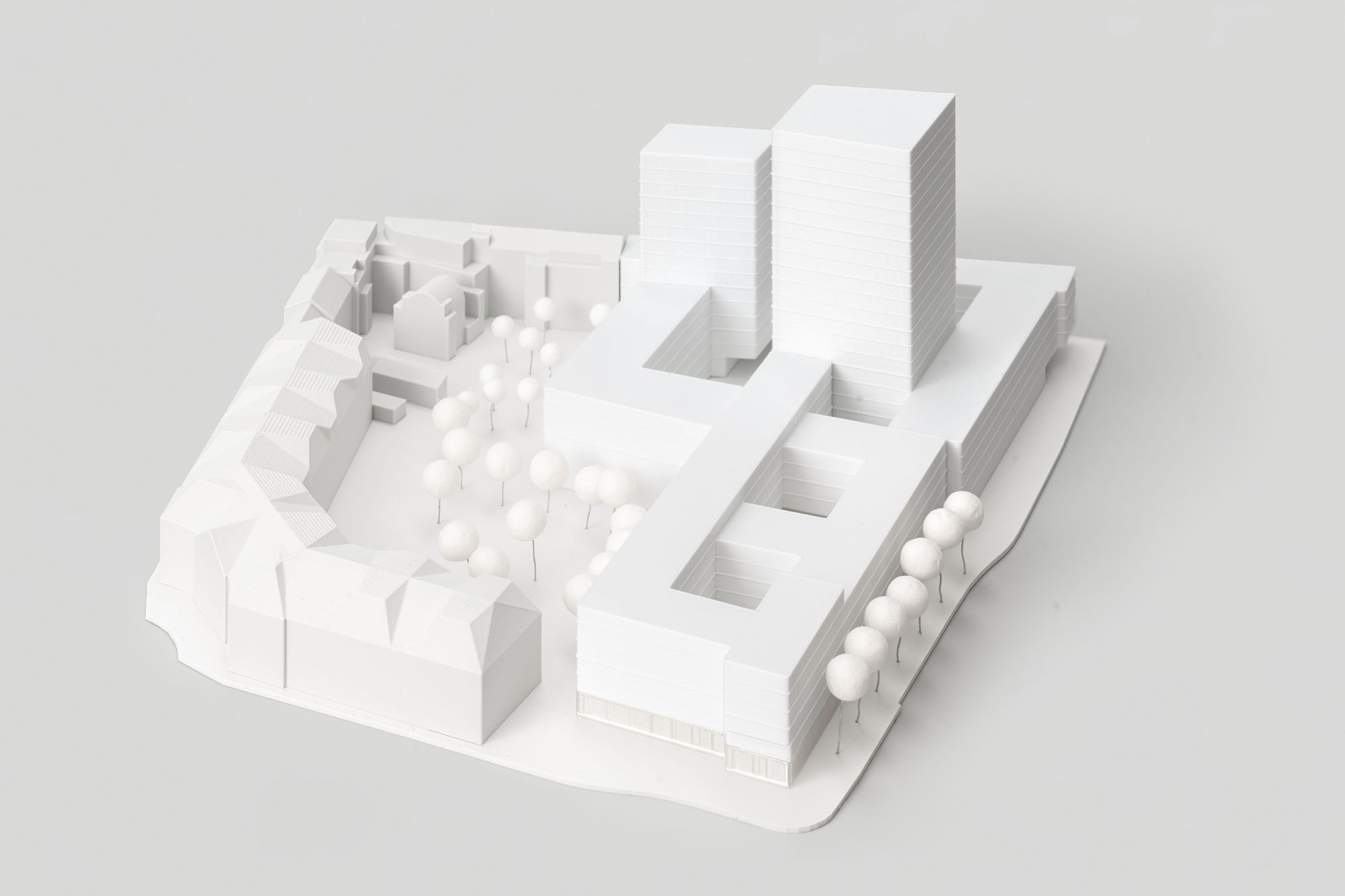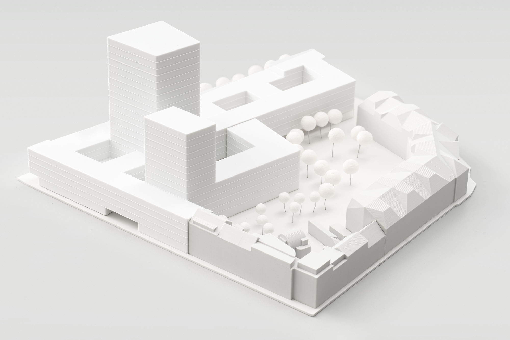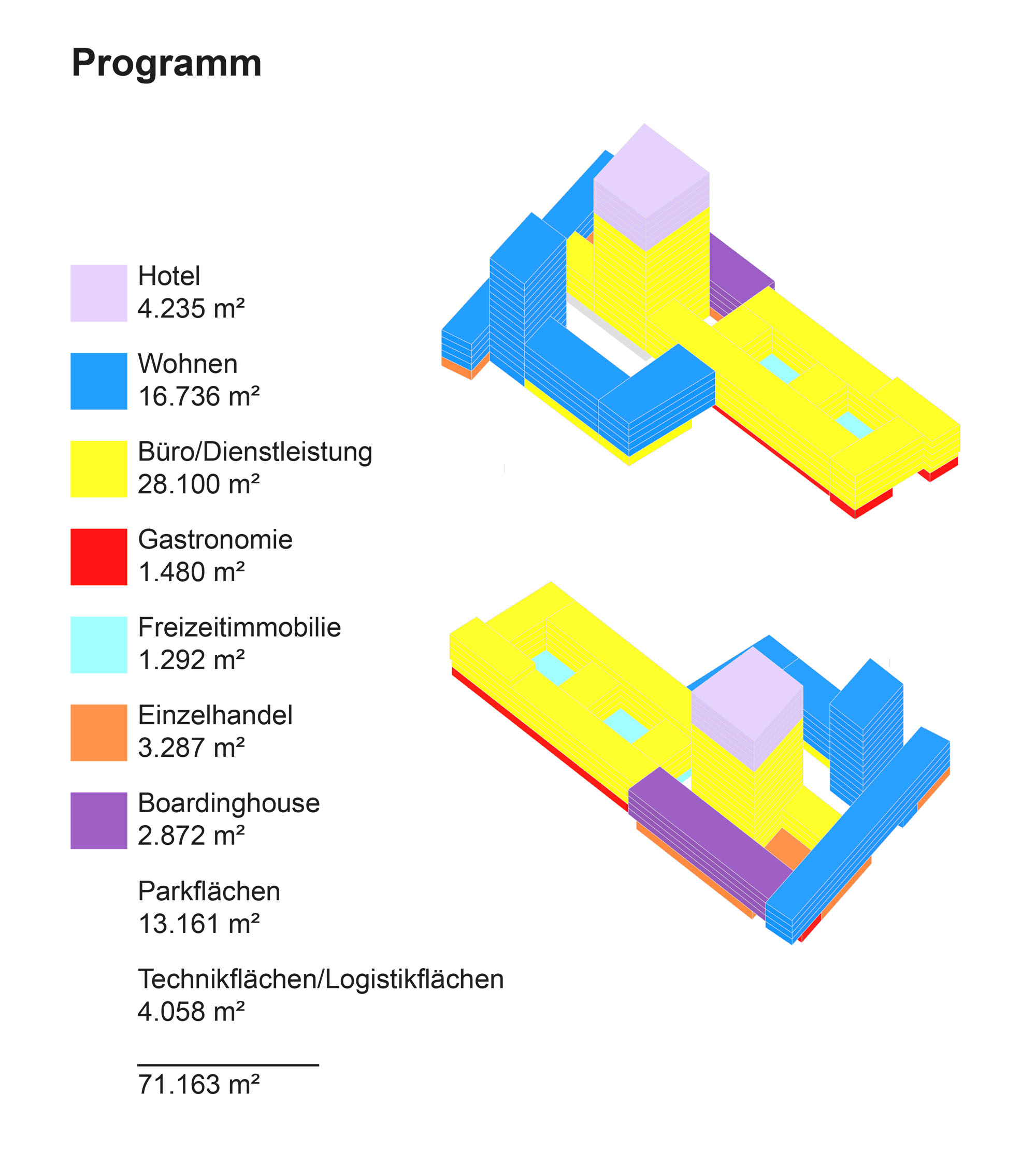 Der Entwurf für das Quartier K100 gliedert sich in drei eigenständige Bausteine mit unterschiedlichen Nutzungen: Wohnen, Arbeiten, Hotel und urbane Versorgung. Eine zentrale Markthalle, gemeinschaftliche Dachgärten und großzügige Innenhöfe schaffen Raum für Begegnung und Vielfalt im Alltag. Die Freiräume orientieren sich an der historischen Gartenstruktur des Markgräflichen Palais und erweitern sich zu einem parkartigen Grünraum mit hoher Aufenthaltsqualität. Durch kompakte Logistik, Mobilitäts-Hubs und eine grüne Promenade wird das Quartier funktional vernetzt und zugleich städtebaulich eingebunden – ein zukunftsweisendes Stadtmodul, das historische Bezüge und neue urbane Lebensformen verbindet.