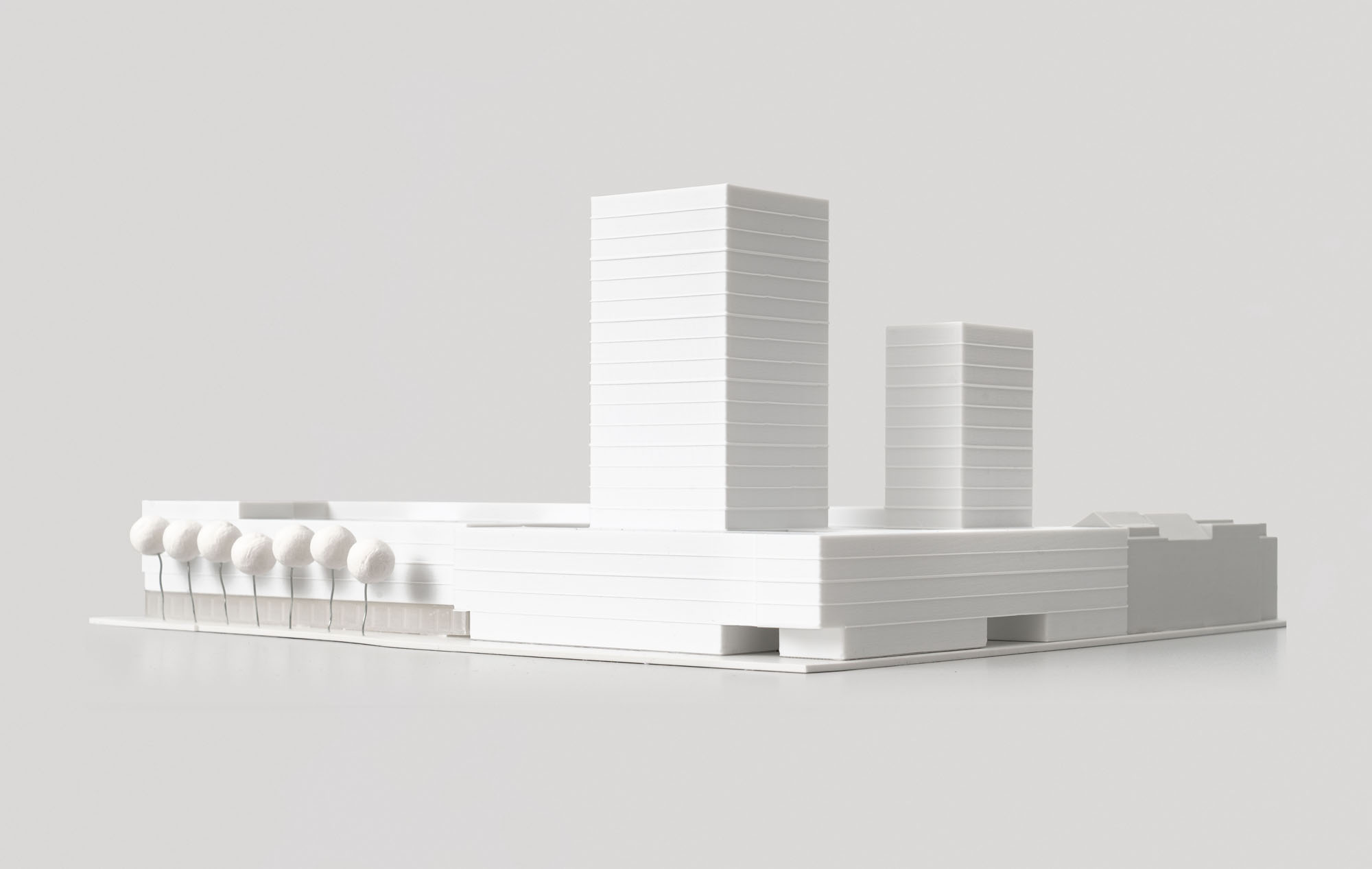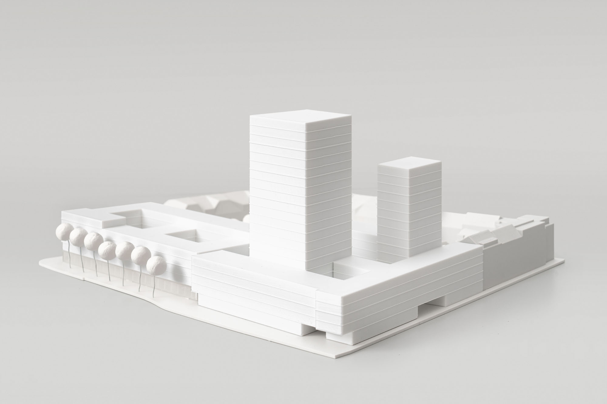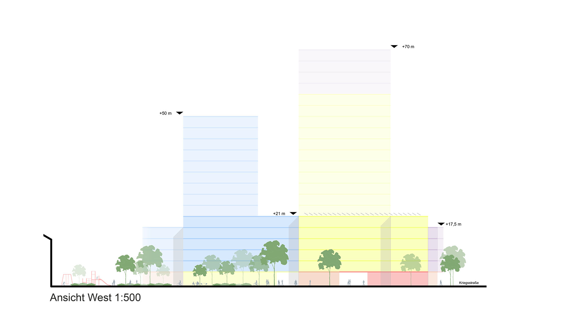 Der Entwurf "Weinbrennerblick 2030" für den Wettbewerb K100 formuliert eine starke, symmetrische Antwort auf die historische Stadtplanung. Entlang der Achse zwischen Rathausturm und Stadtkirche setzen zwei neue Hochpunkte einen markanten städtebaulichen Abschluss und rahmen das neu geplante Landratsamt ein. Diese bewusste Geste im Herzen Karlsruhes markanten Achsen ehrt die Tradition Friedrich Weinbrenners und schafft durch Symmetrie und Ordnung eine moderne, identitätsstiftende Vollendung des Stadtraums.