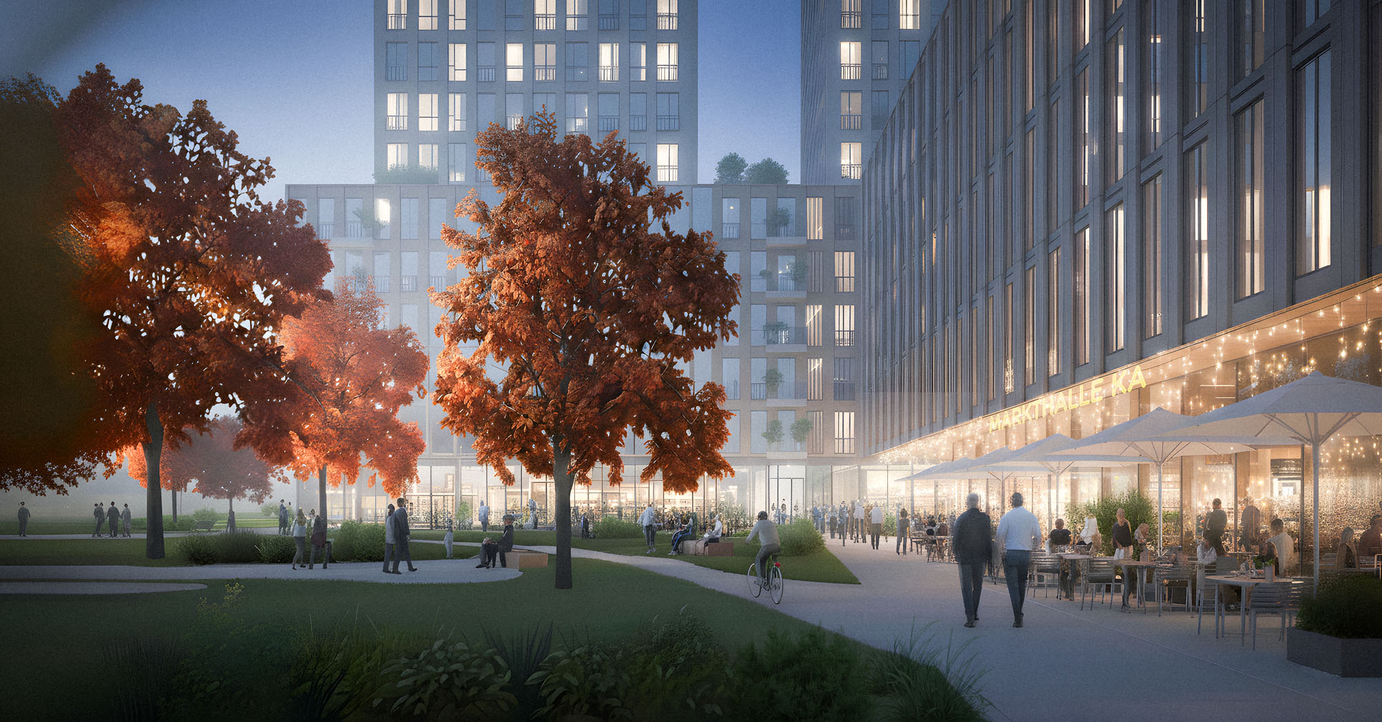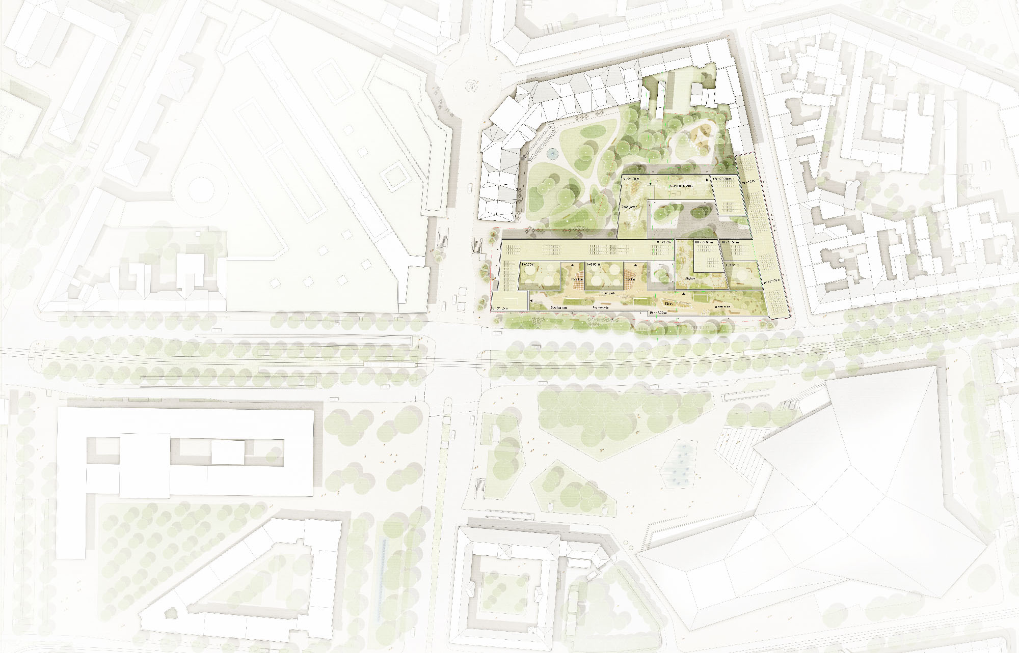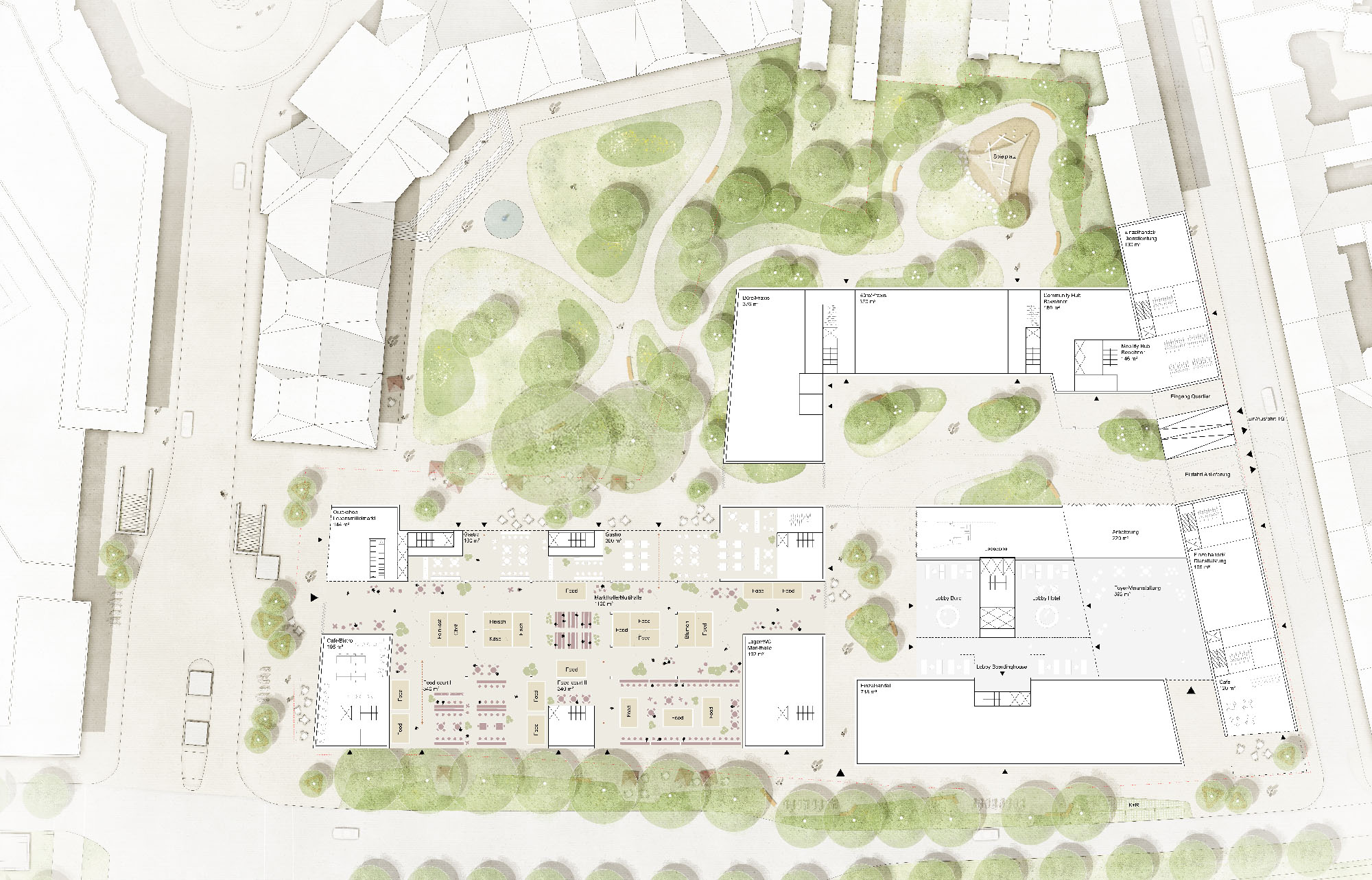 Die Grünfläche des Palais wird nach Süden erweitert, setzt die parkartige Historie fort und bildet zusammen mit dem bestehenden Grünraum einen üppigen, offenen Innenhof. Hier können Menschen spazieren gehen, sich ausruhen und das städtische Grün genießen. Die Außengastronomie bietet zusätzlich die Möglichkeit, in einem angenehmen grünen Ambiente im Freien zu speisen, und erhöht die Anziehungskraft der umliegenden Gastronomiebetriebe. Nach Osten erstreckt sich über einen schmalen Zugang ein privaterer Grünraum, der den Anwohnern dient. Dieser Bereich lädt zum Spazieren, Ausruhen, Treffen und Spielen ein. Dichte Bepflanzung sorgt für Ruhe und Privatsphäre. Die Dächer der Wohngebäude werden als gemeinschaftlich nutzbare Flächen ausgebaut, auf denen die Bewohner grillen, sich erholen oder Urban Gardening betreiben können.