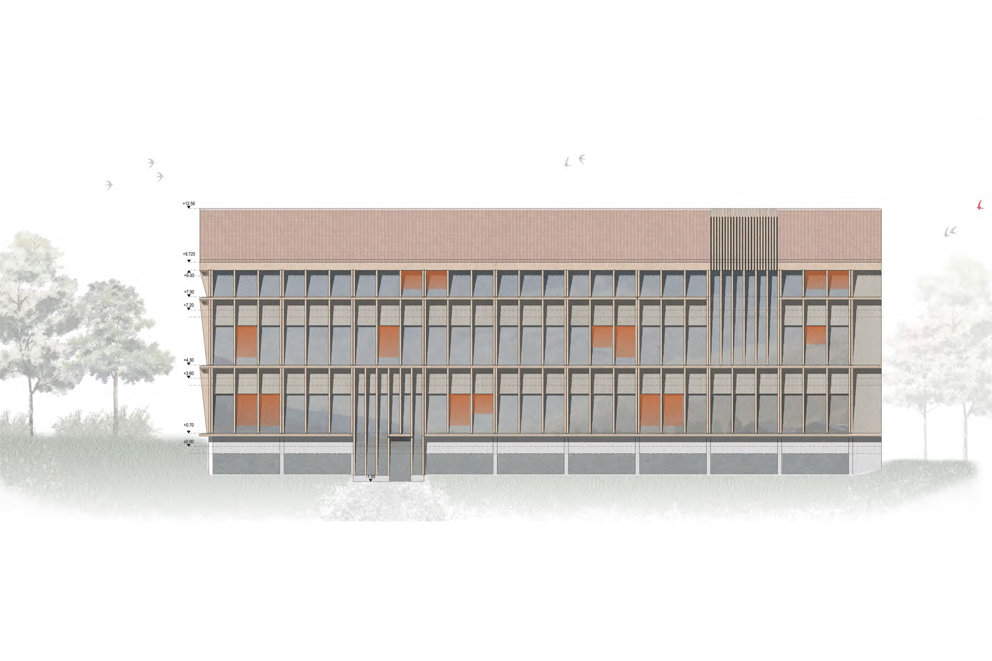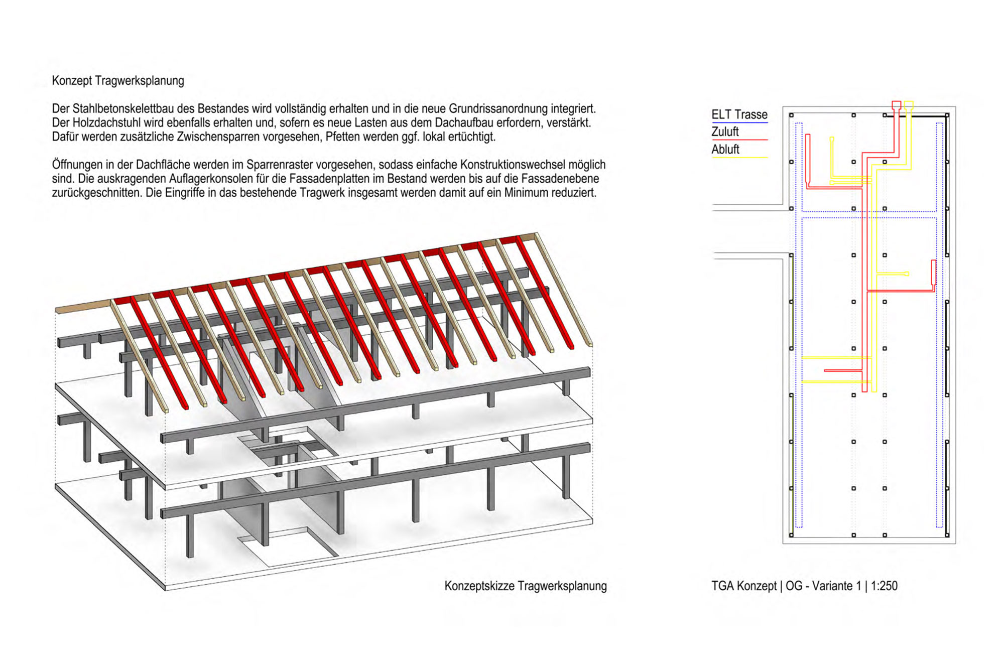 Die Neukonzeption der Fassade ist als Hybridkonstruktion in Holzrahmenbauweise konstruiert. Hierdurch reduzieren sich die notwendigen Eingriffe in den Bestand auf ein Minimum und eine ökonomische Umsetzung kann realisiert werden.