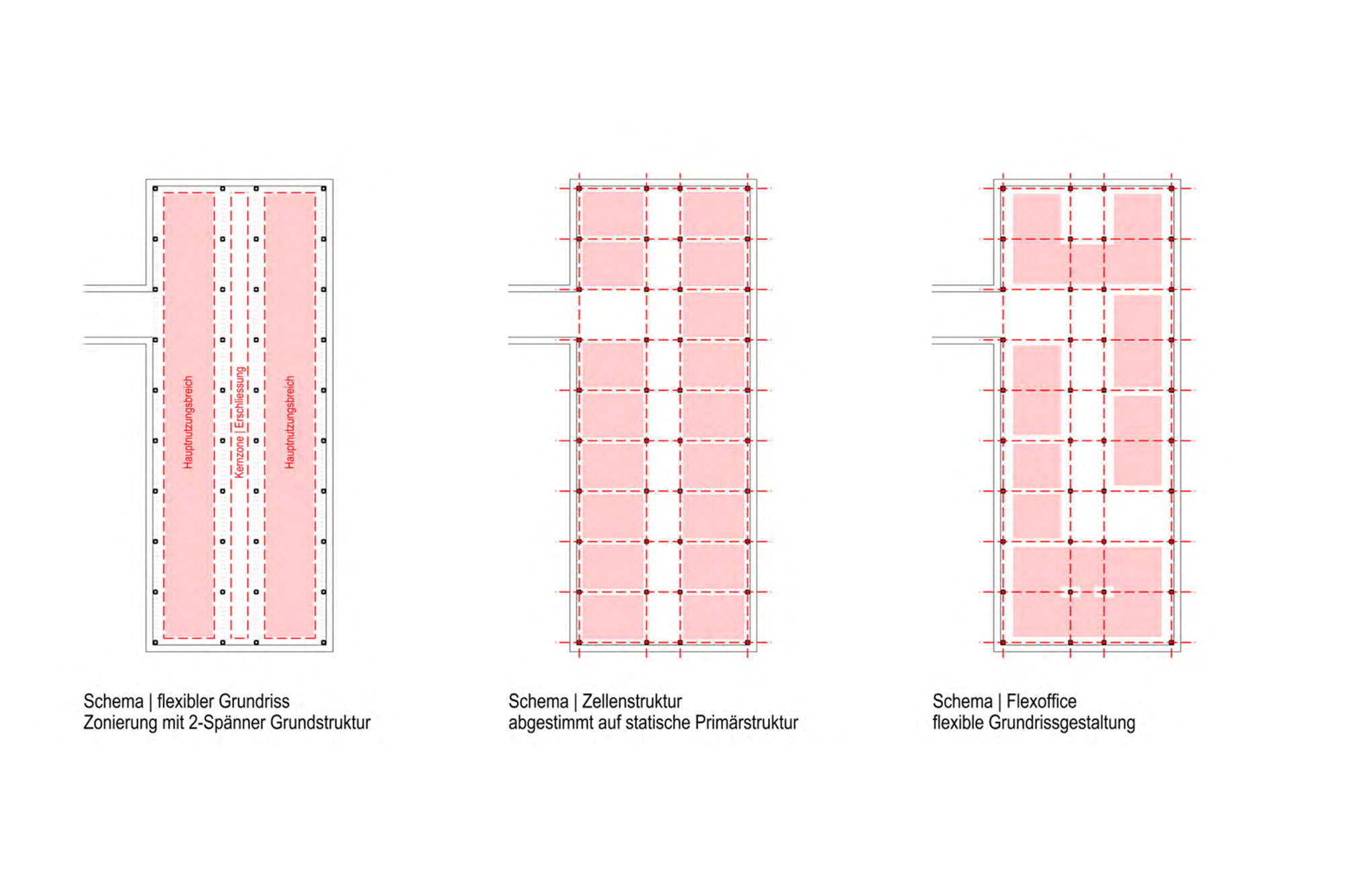 Neben der energetischen Fassadensanierung wird die bestehende Grundrissstruktur auf die statische Primärkonstruktion zurückgebaut. Der Stahlbeton-Skelettbau bietet bereits ein hohes Maß an Flexibilität für die gewünschten Labor – Typologien. Weitere Arbeitsgruppen der Departements können somit problemlos neu organisiert und in den Südwestflügel integriert werden. So kann auf ein Abbruch verzichtet werden und nachhaltig mit dem Bestand gearbeitet werden.