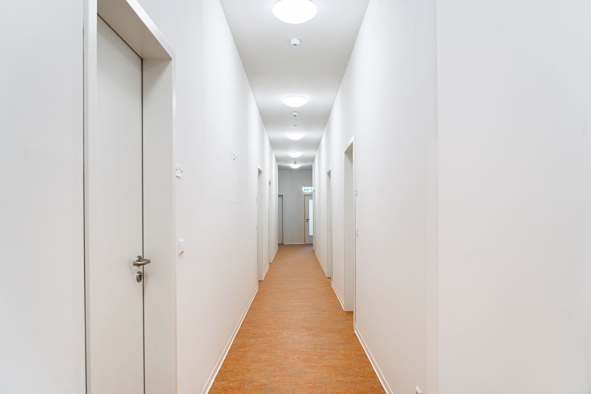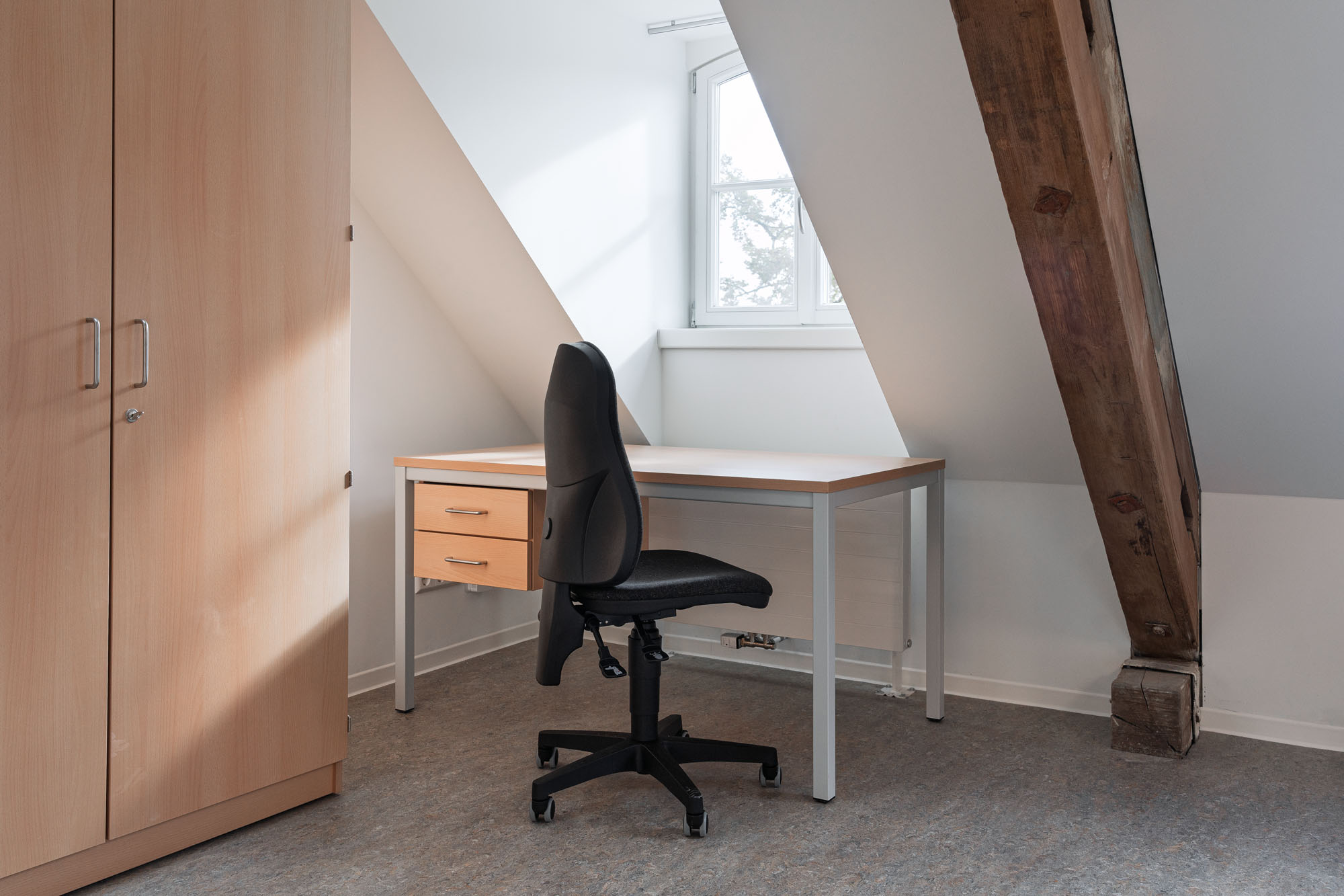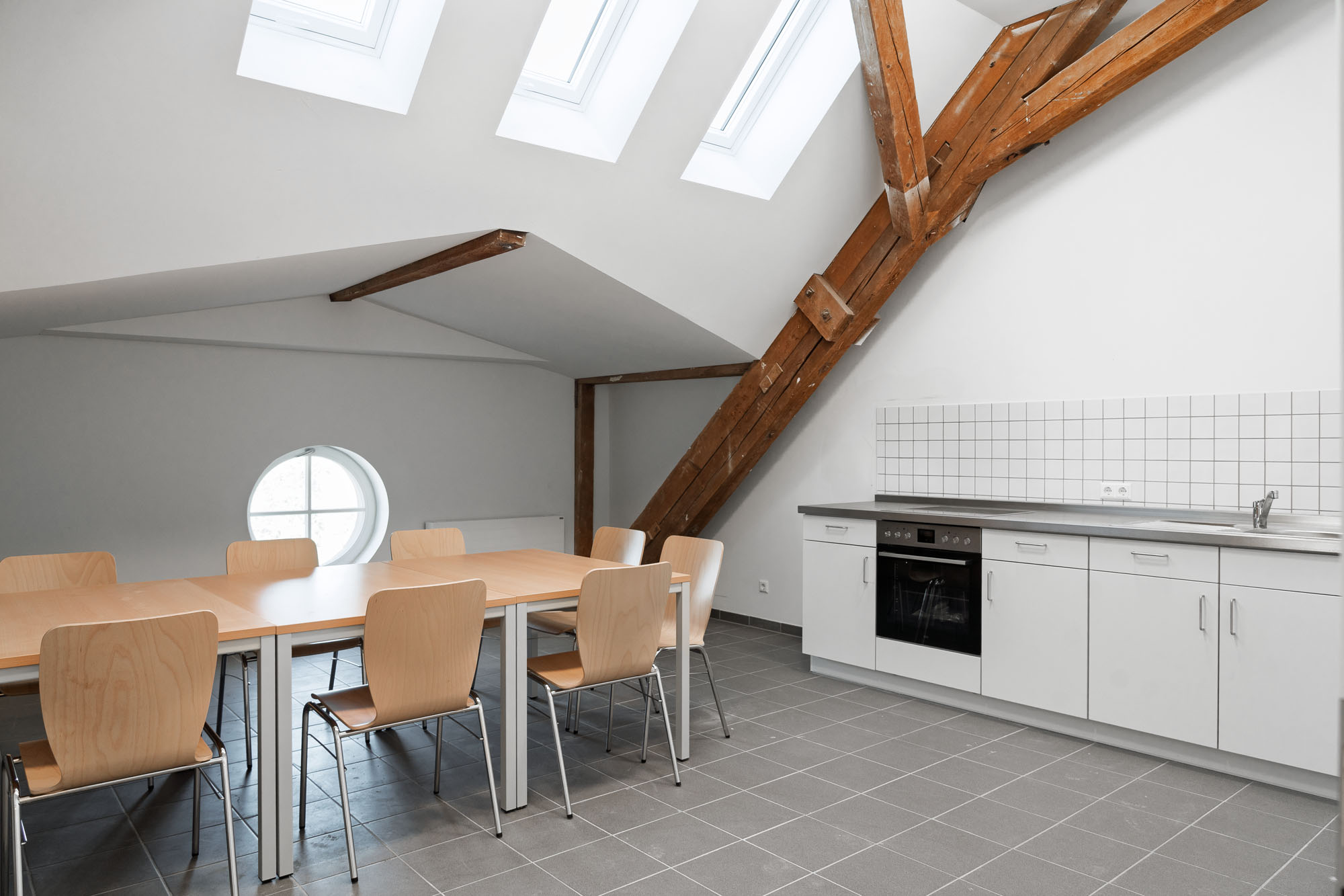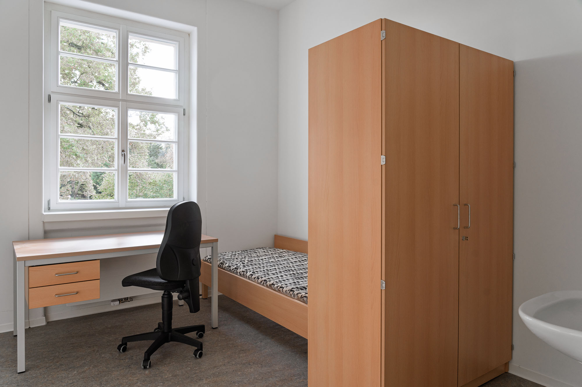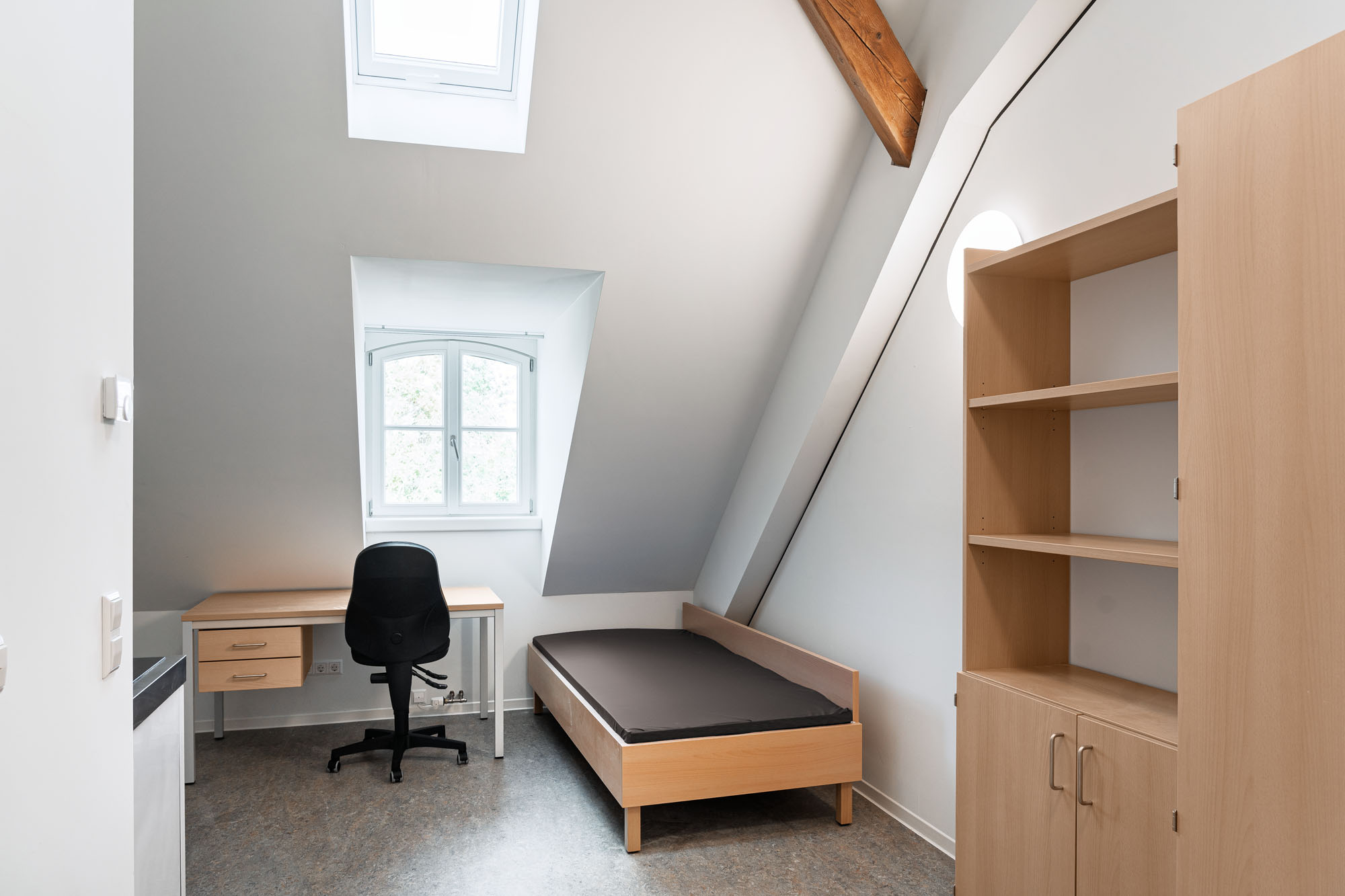 Im zweiten Obergeschoss befinden sich kompakte 1‑Zimmer‑Apartments, die jeweils über ein eigenes Bad und eine kleine Küchenzeile verfügen. Sie bieten den Studierenden Rückzugsorte mit maximaler Funktionalität und Privatsphäre – modern, effizient und auf die Bedürfnisse eines zeitgemäßen studentischen Wohnens zugeschnitten.