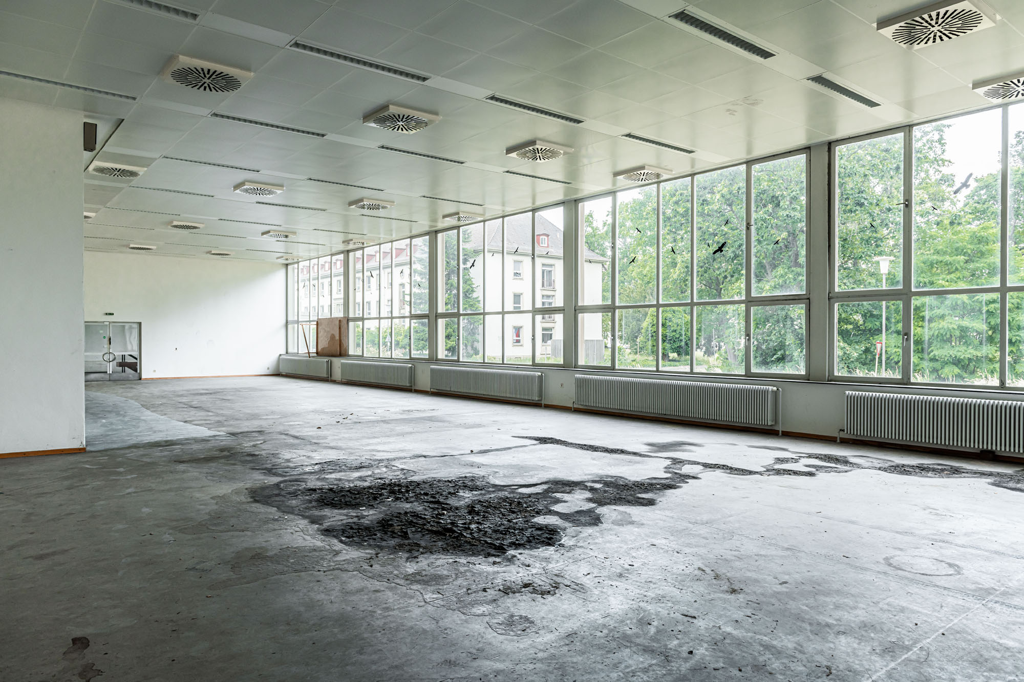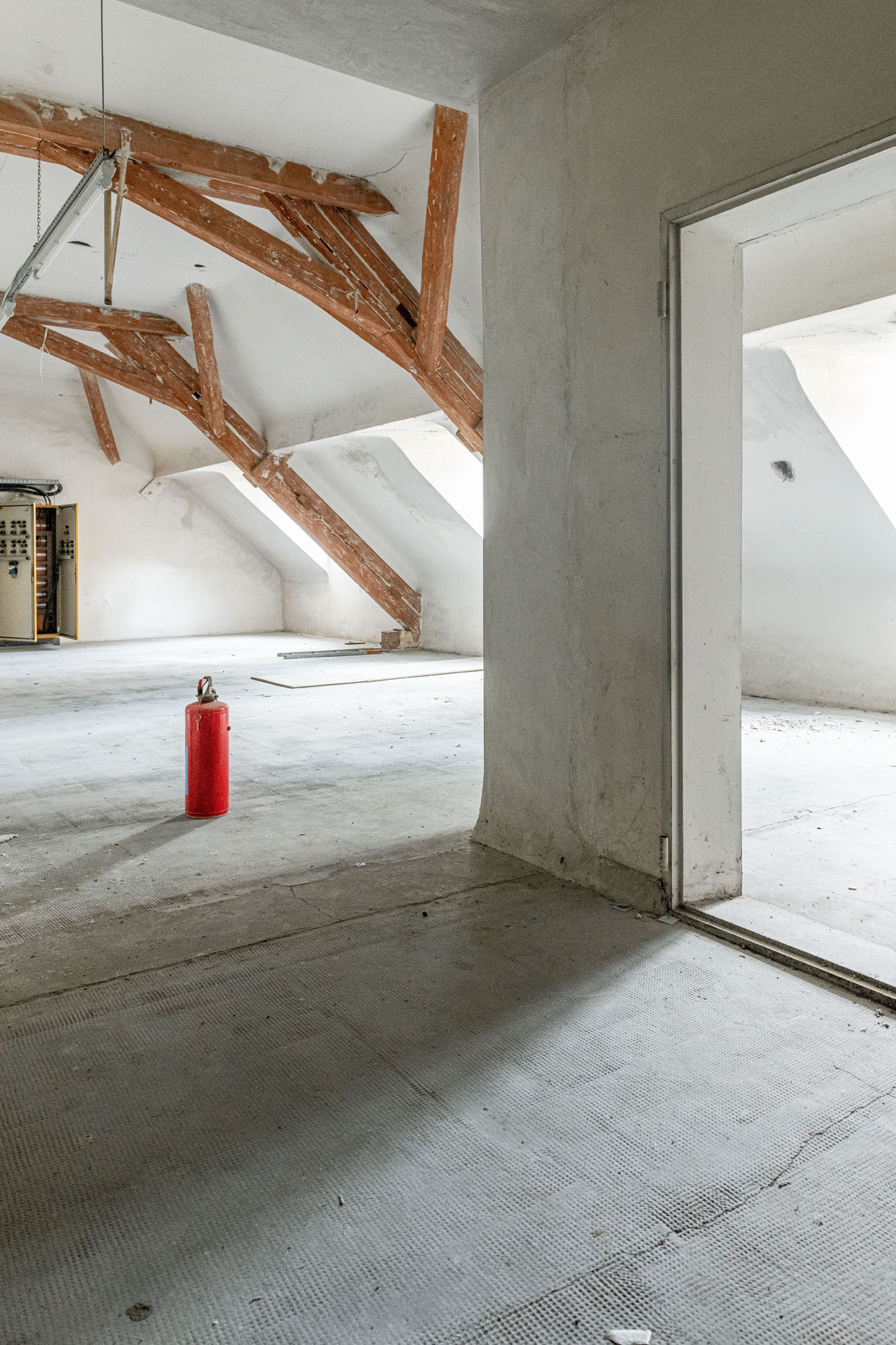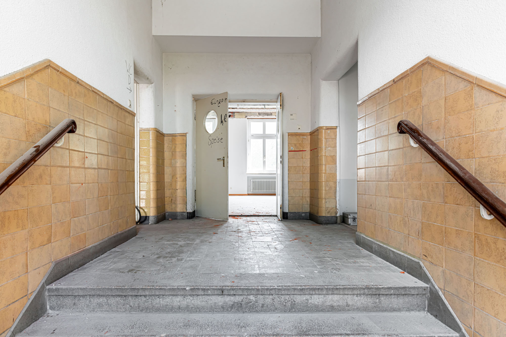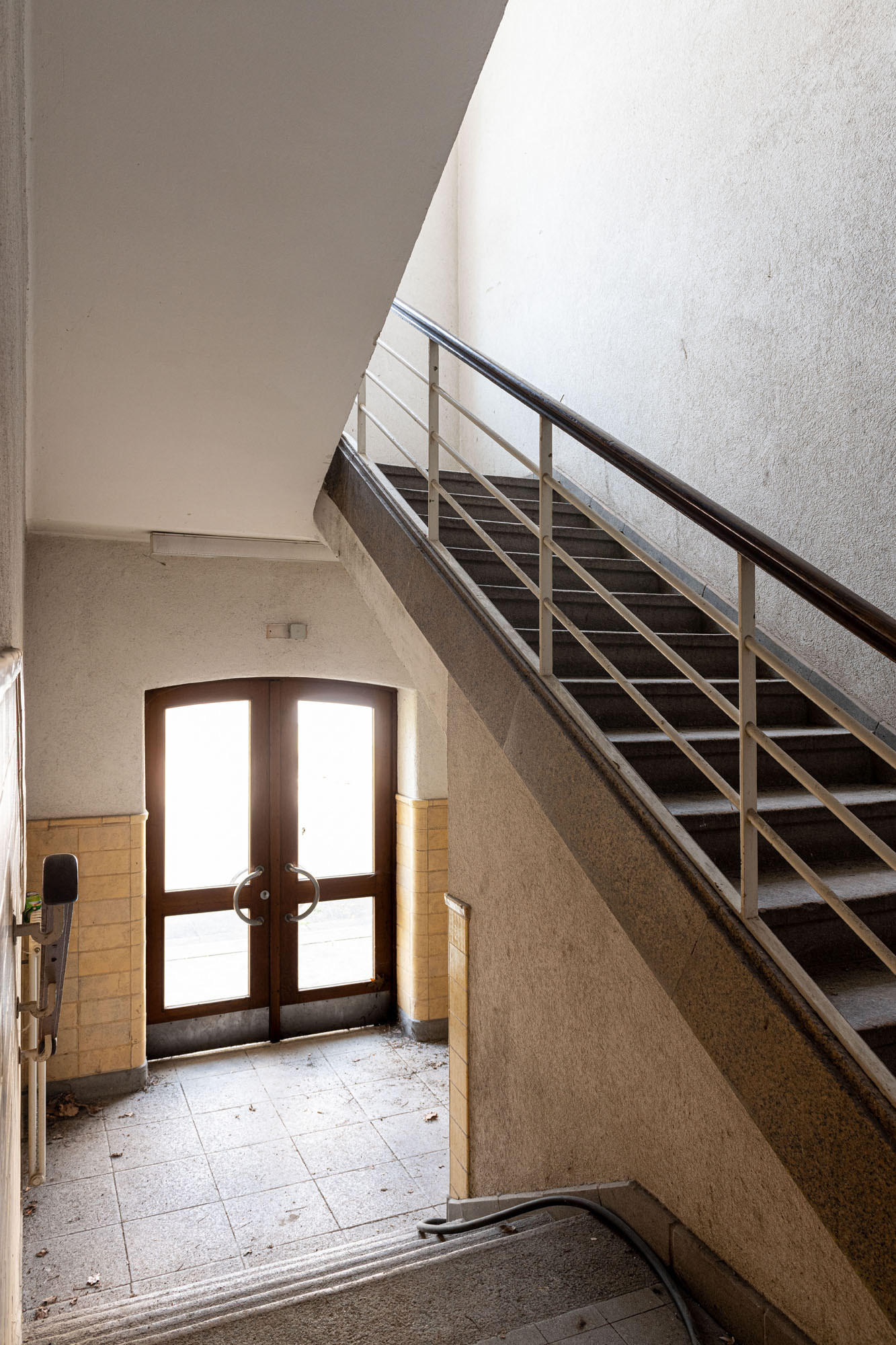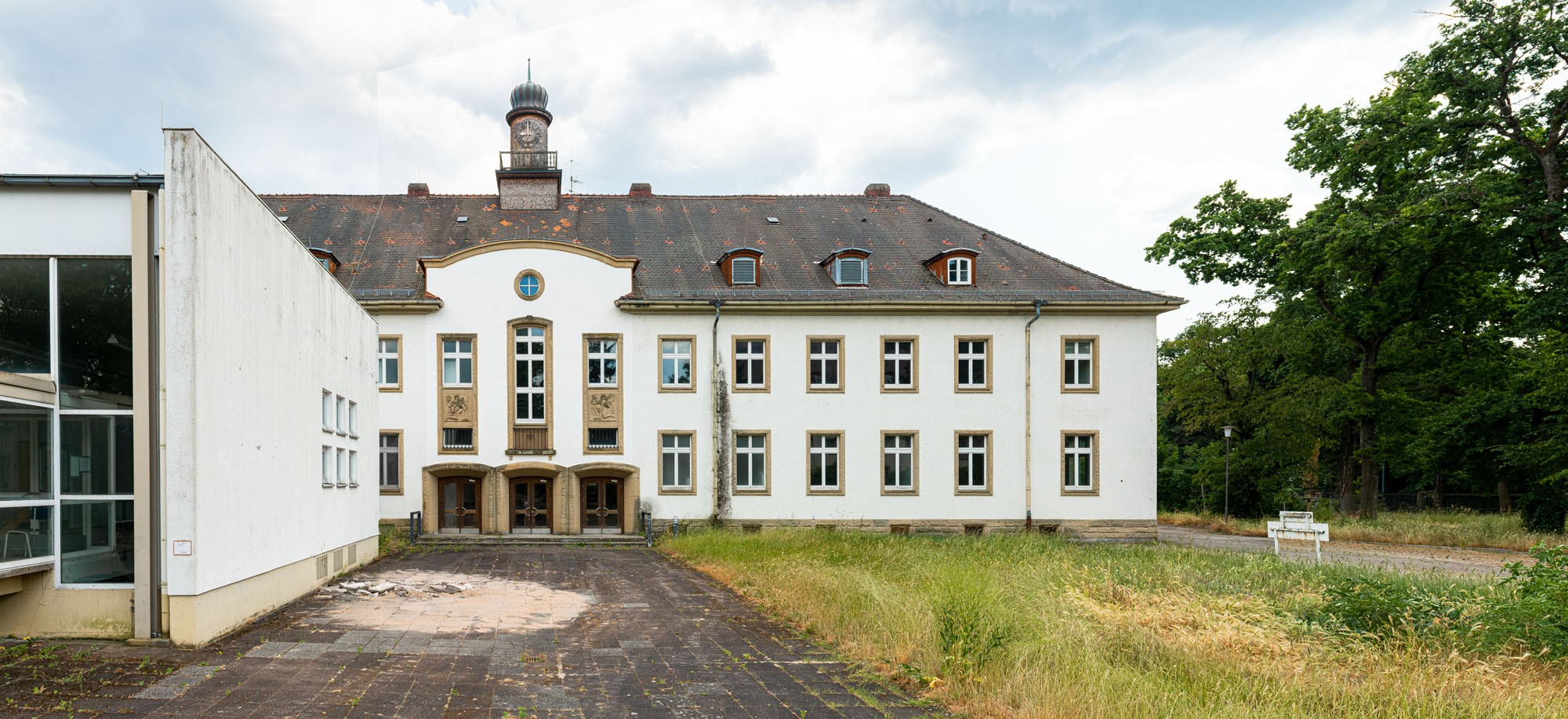 Das historische Gebäude wird entsprechend entkernt und von einer Bunkeranlage sowie späteren Anbauten aus den 70er Jahren befreit, sodass die ursprüngliche Symmetrie und die denkmalgeschützte Hauptansicht wiederhergestellt werden. Erhalten bleiben die drei originalen Eingänge, die Treppenhäuser, Decken und tragenden Wände sowie die Fassadenhülle – im Sinne eines respektvollen Umgangs mit dem Bestand. Die nicht denkmalgeschützten Bauelemente werden vollständig abgebrochen und durch eine funktionsgerechte Neubau‑Ergänzung ersetzt.