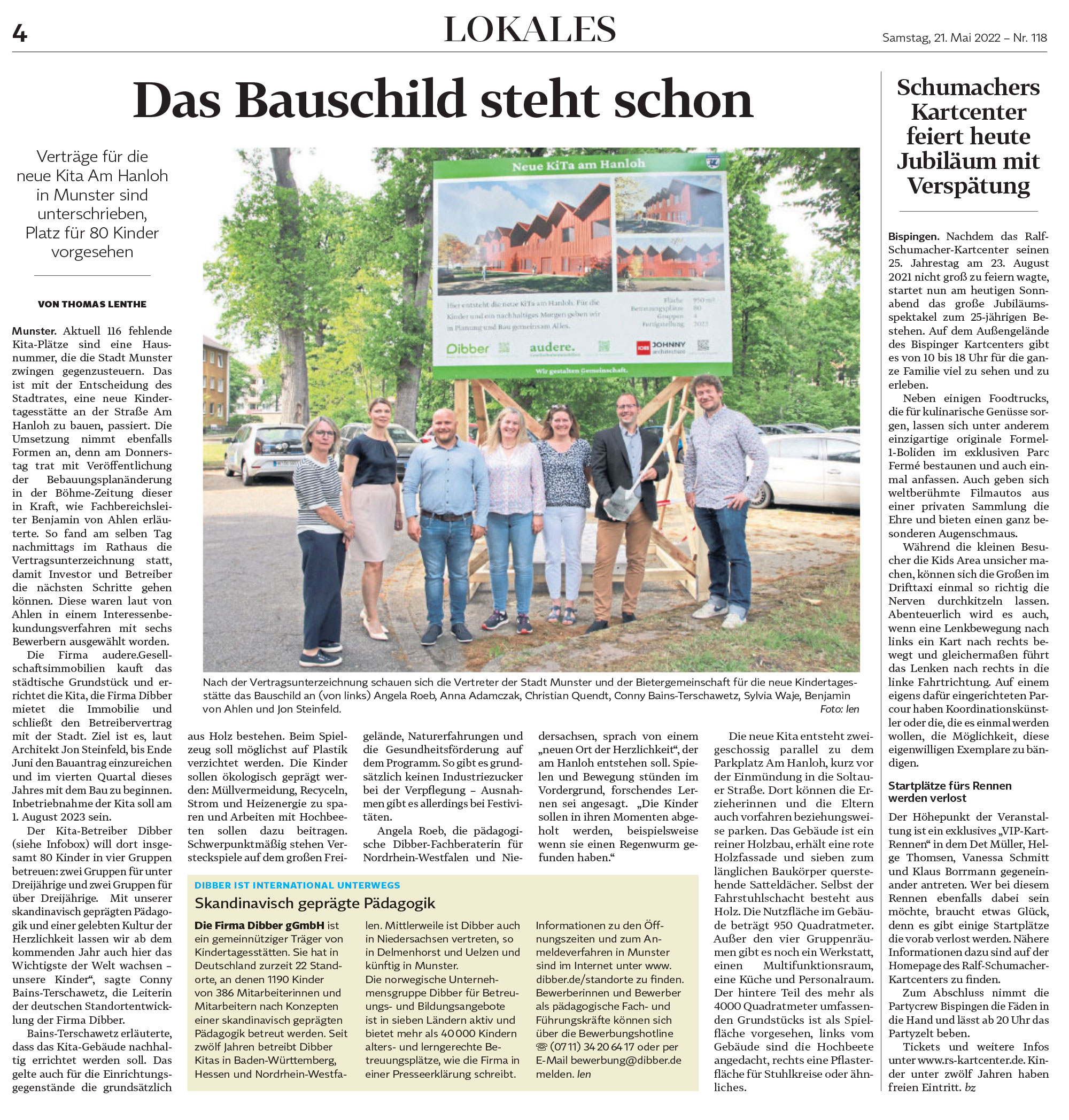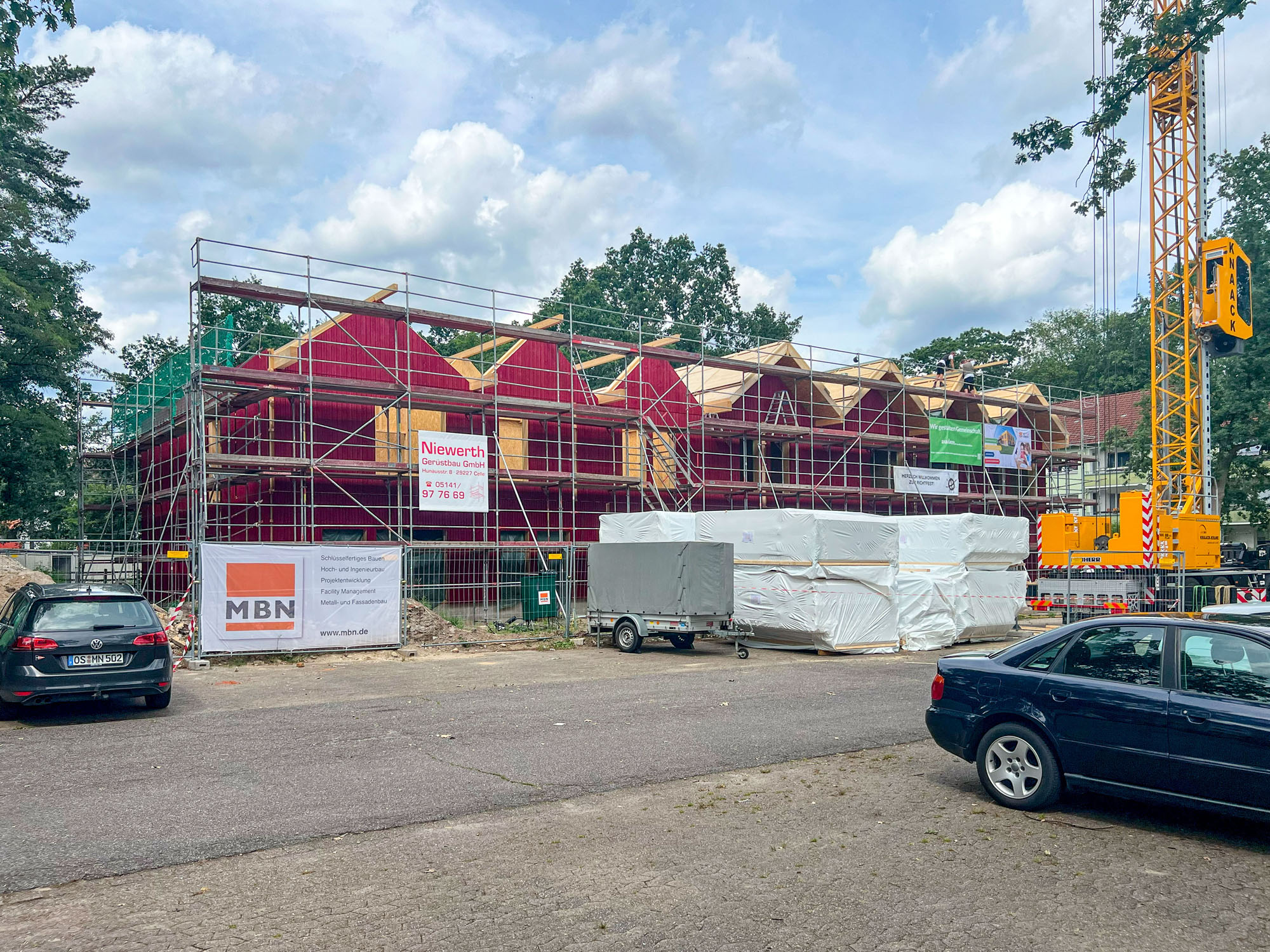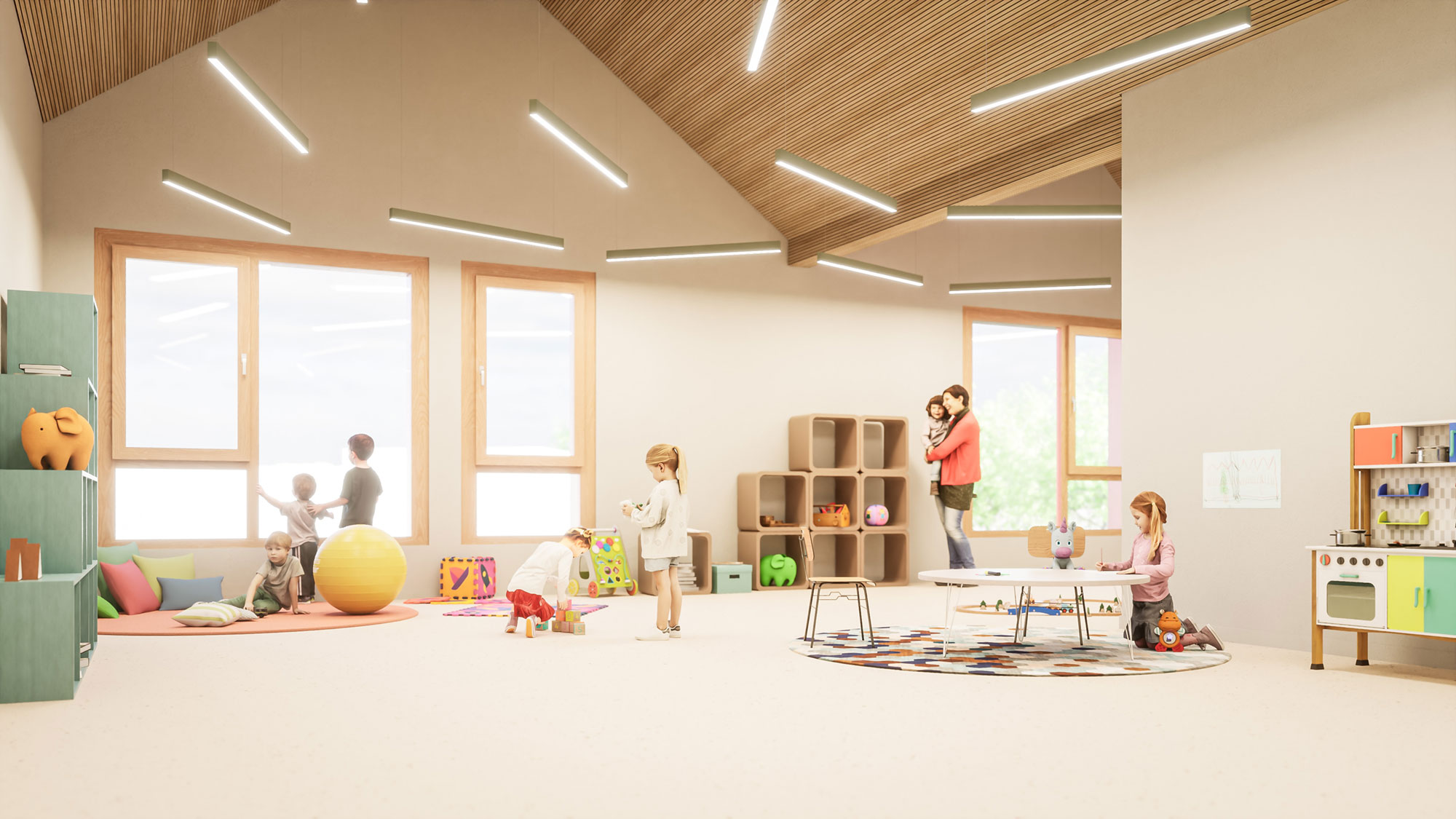 Seit Februar 2025 werden 80 Kinder im Krippen- und Kindergartenalter in der neuen Kita „Am Hanloh“ ihr neues, zweites Zuhause beziehen können. In Munster wird für sie ein neuer, lebensfroher Ort entstehen. Die rote Fassade und die spielerische Dachform schaffen einen identitätsstiftenden Ort, der die Nutzer täglich begleiten wird. Das Gebäude wird als reiner Holzbau und mit einem ausgeklügeltem Technik-Konzept realisiert und wird somit einer der nachhaltigsten Kindertagesstätten Niedersachsens sein.