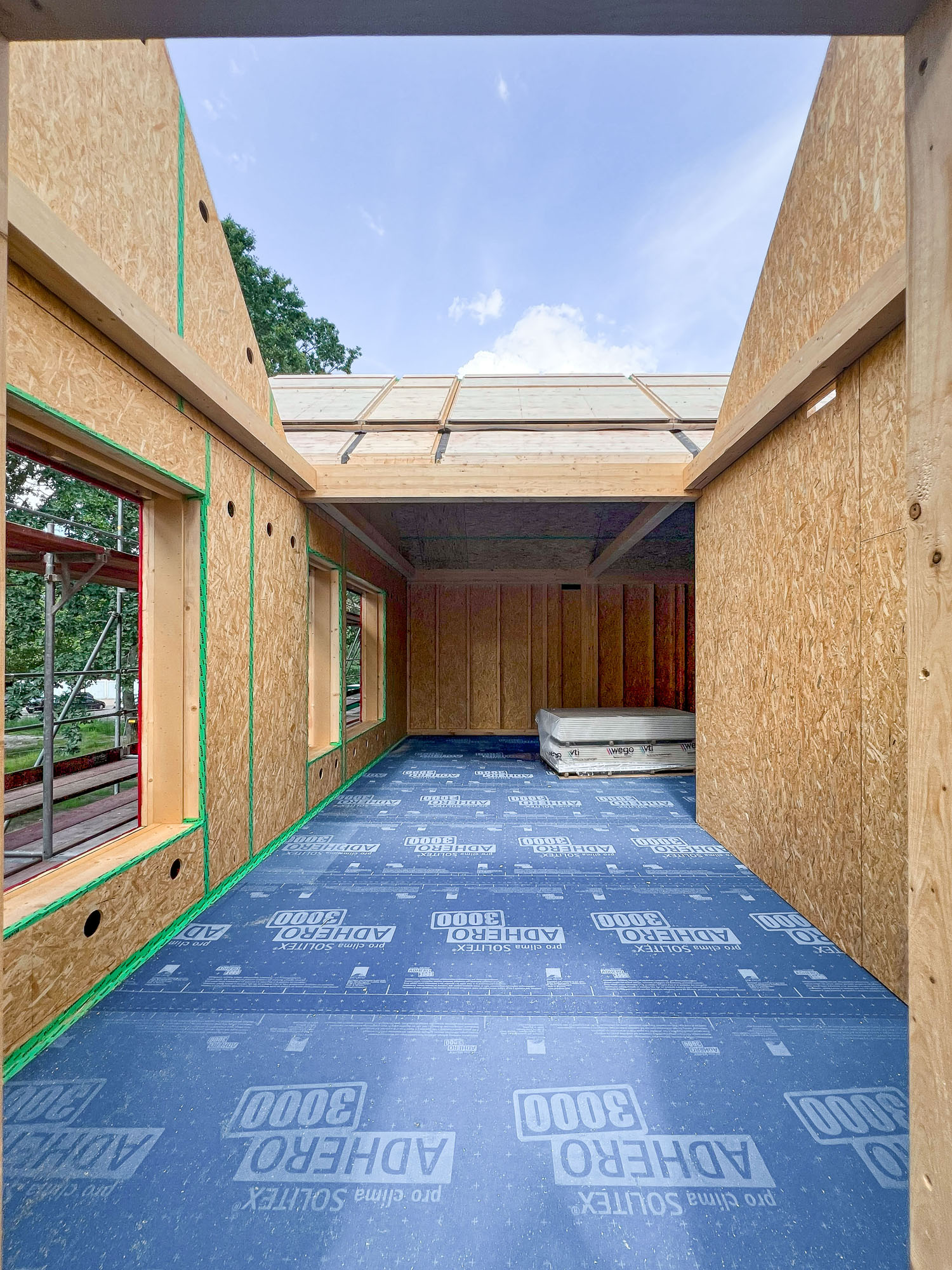 Im Innenraum hält sich die Architektur zurück. Das gefaltete Dach ist erlebbar, aber zurückhaltend gestaltet. Wichtige Orte und Orientierungspunkte werden durch farbstarke, freie Formen gekennzeichnet.