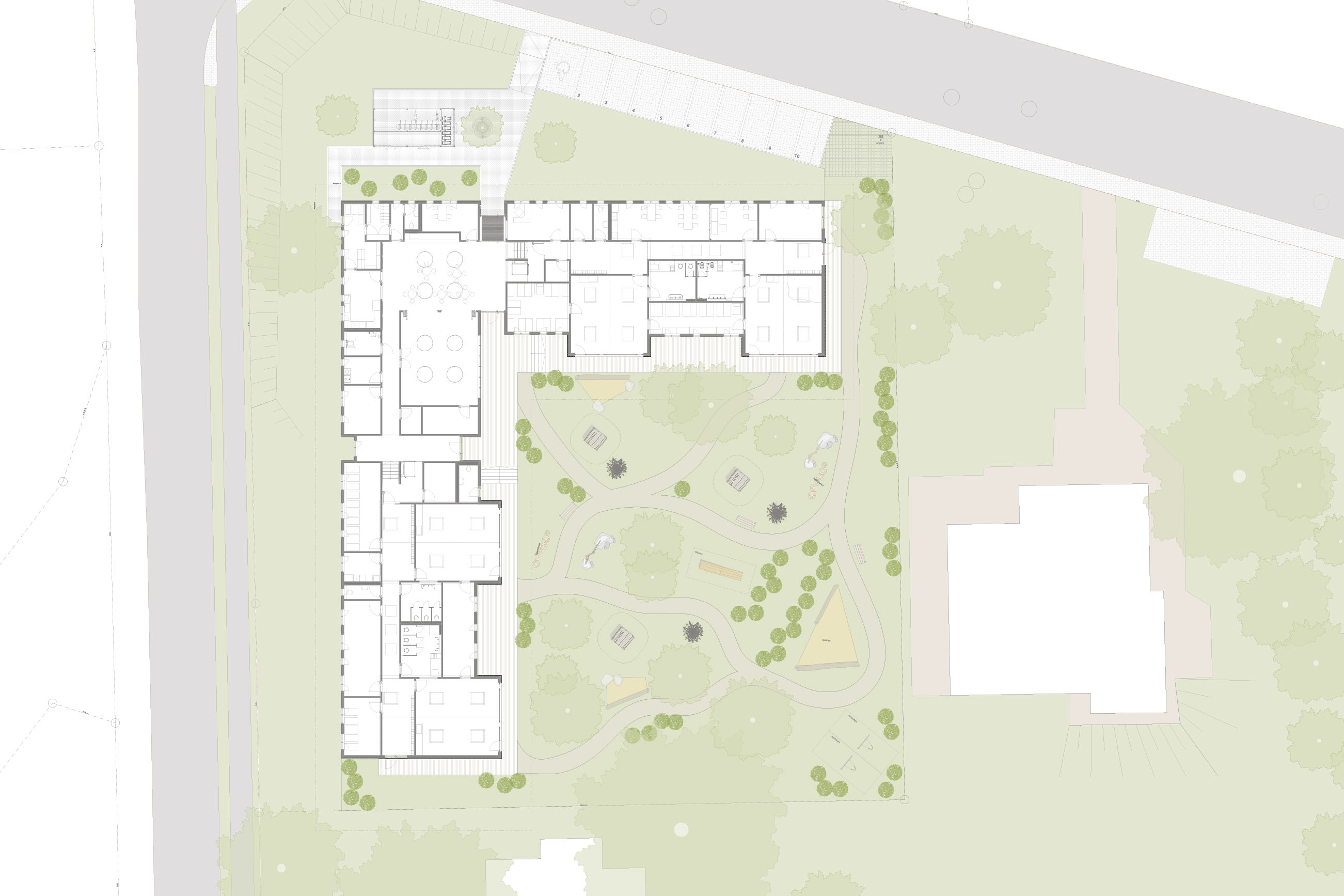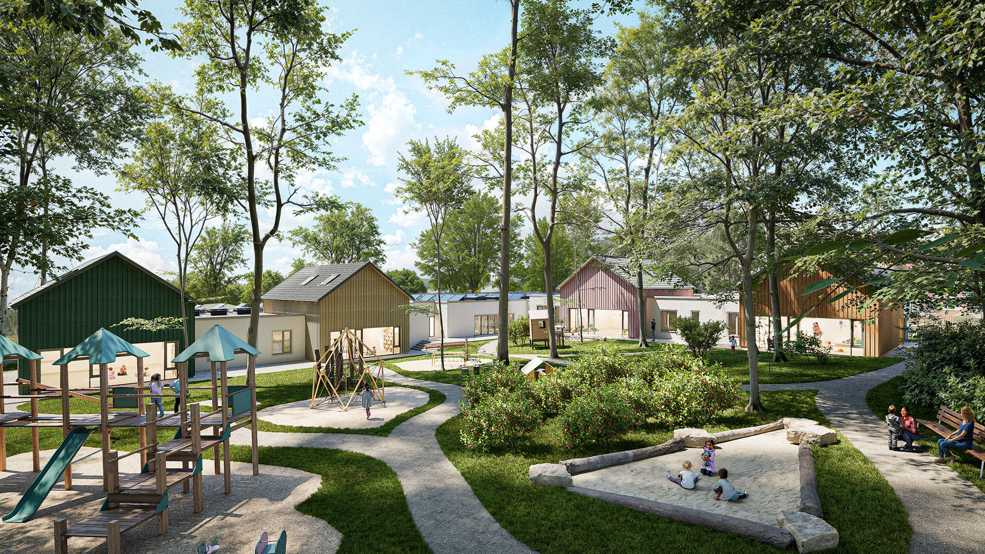 Der rund 1.800 m² große, geschützte Außenbereich ist ebenfalls differenziert gestaltet und bietet Platz für altersgerechtes Spielen, Lernen und Bewegen. Nebengebäude für Müll, Fahrräder und Kinderwagen ergänzen das Ensemble funktional und gestalterisch.