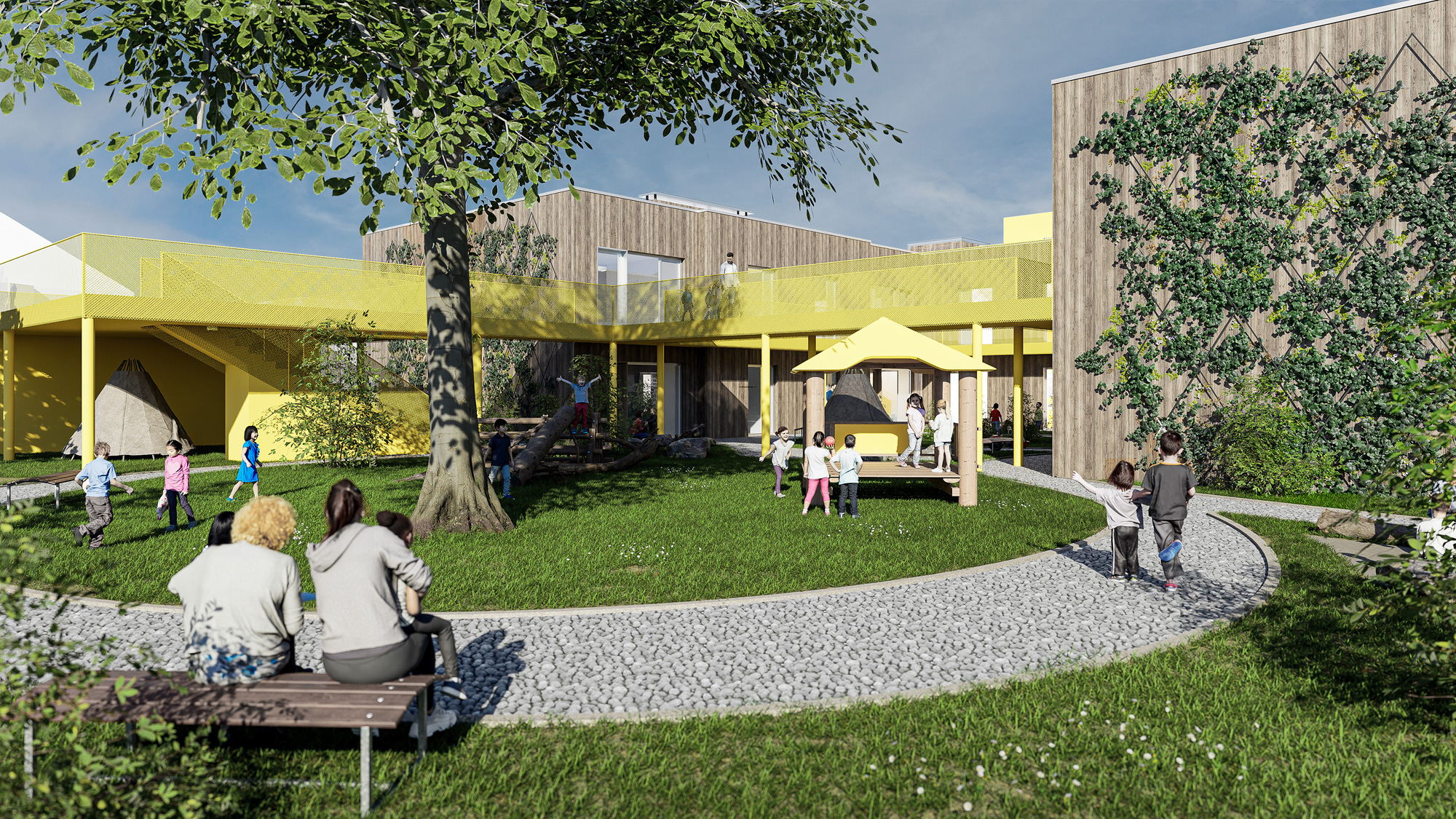 Ziel dieses Projektes und ihrer Schwester, der KiTa Osterholz, ist es, die Anforderungen an die Planung und Realisierung von Immobilien in zirkulärer Bauweise und als Low-Tech-Gebäude zu erfüllen und so einen Modellcharakter zu schaffen. Durch die Standortwahl, effiziente Raumplanung sowie Betriebs- und Instandhaltungskosten-Konzepte werden wirtschaftlich funktionierende Bauten entwickelt. Grundlage ist eine fortlaufende Lebenzykluskosten-Berechnung (LCA) auf 35, 50 und 80 Jahre. Ergebnis hiervon: Die Reduktion der Technik auf das notwendige und einen stärkeren Fokus auf die Konstruktion. Die Gebäude verbrauchen weniger, es muss also weniger kompensiert werden. Und somit können wir die Grundlage schaffen, langfristig einen positiven Effekt auf die nahe Umgebung zu belegen. Was unterm Strich eine regenerative Architektur zu leisten hat.