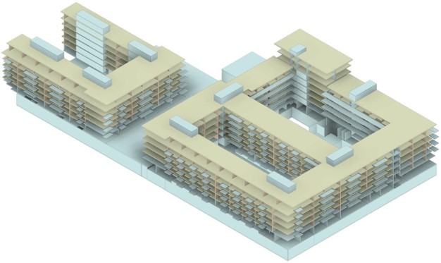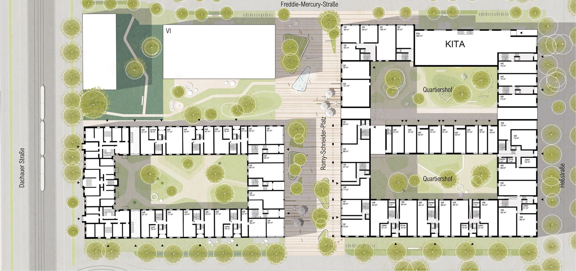 Die beiden Gebäude des MU3 und MU4 bilden eine Nachbarschaft. Das größere (MU3) umschließt zwei Innenhöfe. Jener mit Spielplatz ist der KITA im nördlichen Teil zugeordnet. Der südliche Hof soll den zukünftigen Mieter:innen der Wohnungen einen Rückzugsort bieten, aber auch zu gemeinsamen Aktivitäten einladen.
